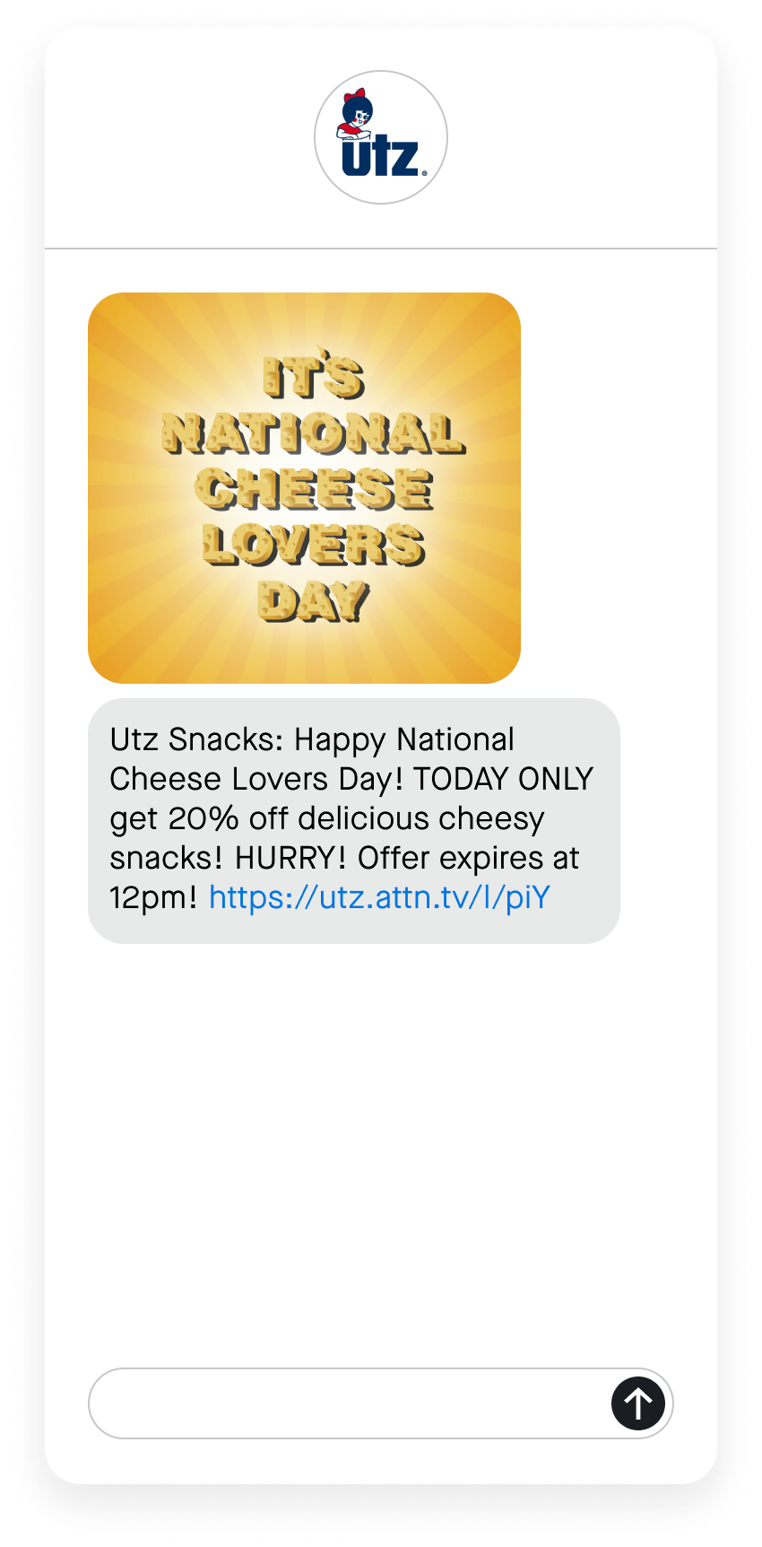 Snack brand Utz texted their subscribers with a seasonal, limited-time offer focused on celebrating National Cheese Lovers Day. This playful message offered subscribers a 20% off discount on cheesy snacks to play into the food holiday. Utz communicated the urgency of this limited-time offer (“TODAY ONLY” and “HURRY! Offer expires at 12pm!”) and ended with a direct link to shop their selection of cheesy snacks.