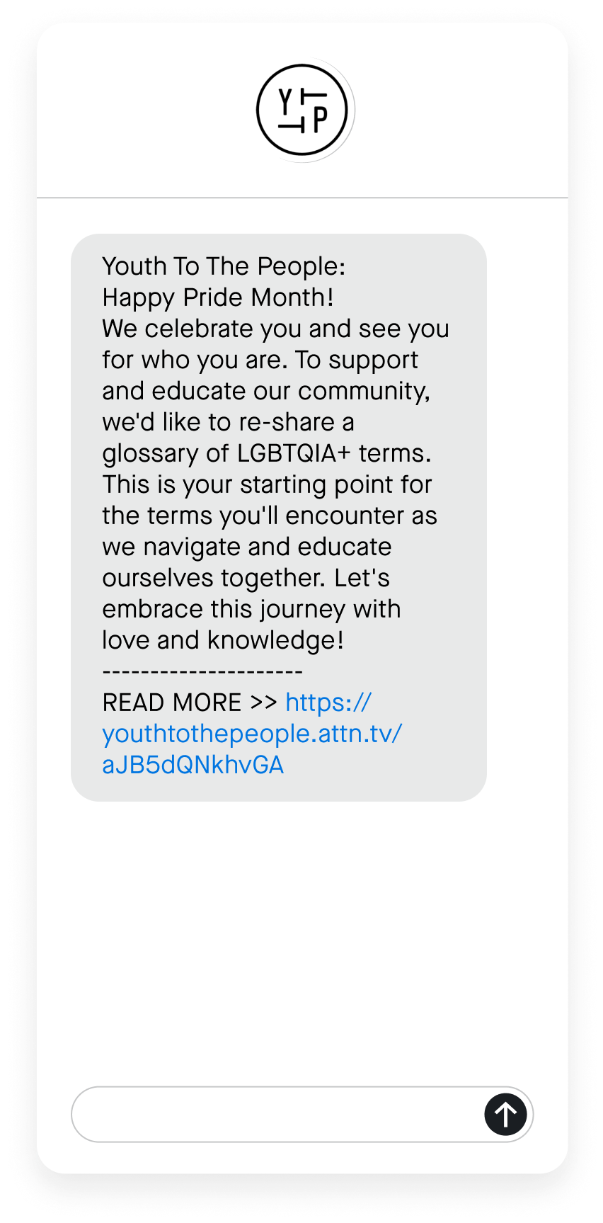 Beauty brand Youth to the People sent this SMS message to kick off Pride Month by supporting and educating their community. They shared an educational resource, a glossary of LGBTQIA+ terms, to help subscribers learn about words they might come across during Pride celebrations. Their non-promotional message is one of knowledge and love.