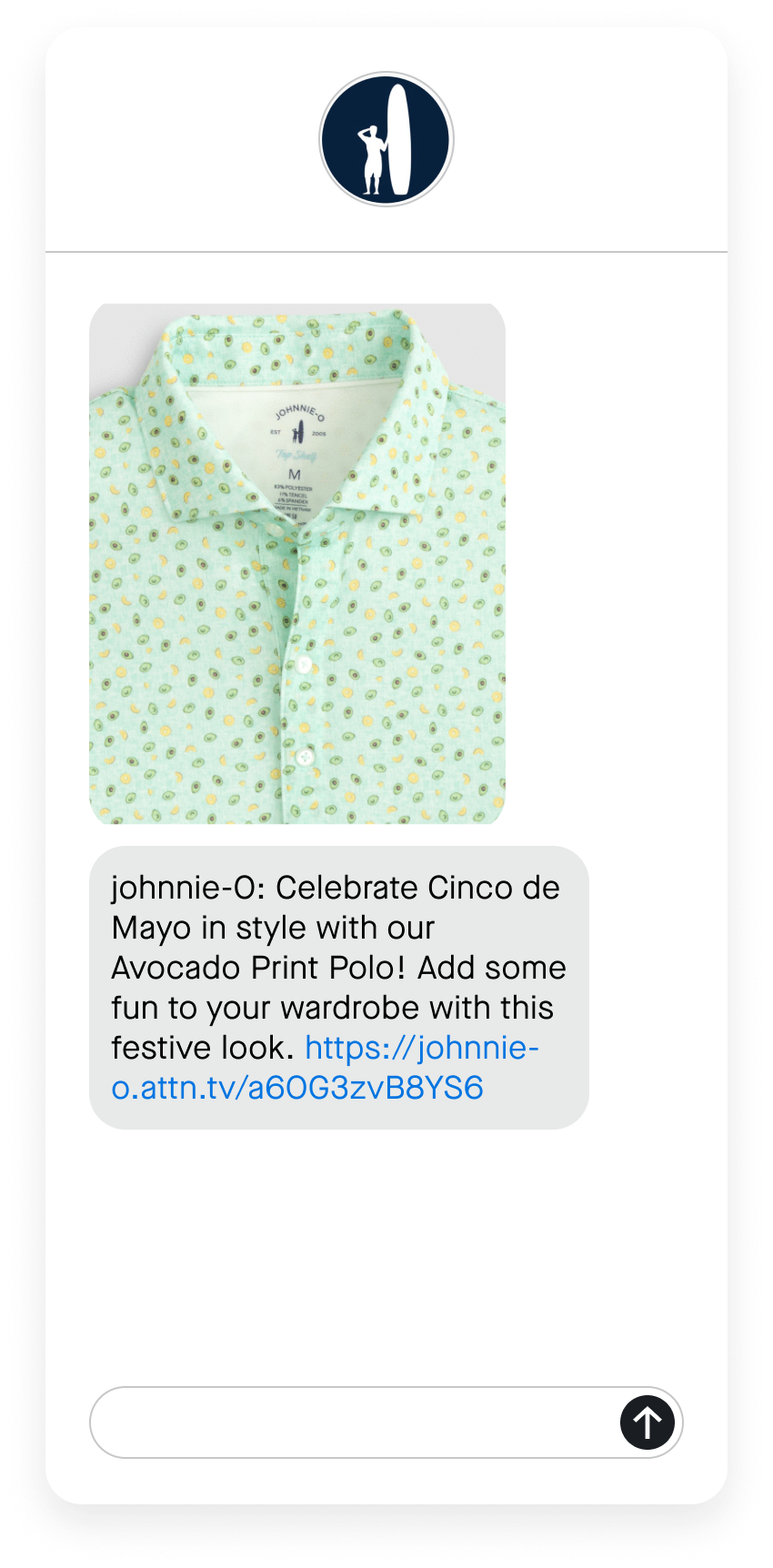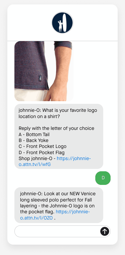 Men’s clothing brand johnnie-O engaged SMS subscribers in a highly personalized experience using conversational text messaging. In this back-and-forth messaging flow, subscribers responded with their preferred logo placement to trigger a relevant product recommendation. This automated flow promoted the brand’s new product while meeting subscribers’ personal preferences.