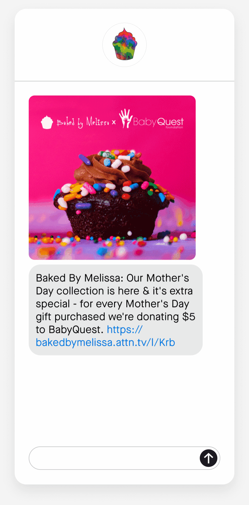 Baked by Melissa helped inspire their SMS subscribers’ Mother’s Day gifting while getting them involved in the brand’s charitable initiatives. The cupcake brand highlighted the organization they’re supporting, Baby Quest, and the impact of every purchase. The animated GIF showcased the product variety of the seasonal collection. The brand ended with a direct link for subscribers to easily learn more and shop with a purpose.