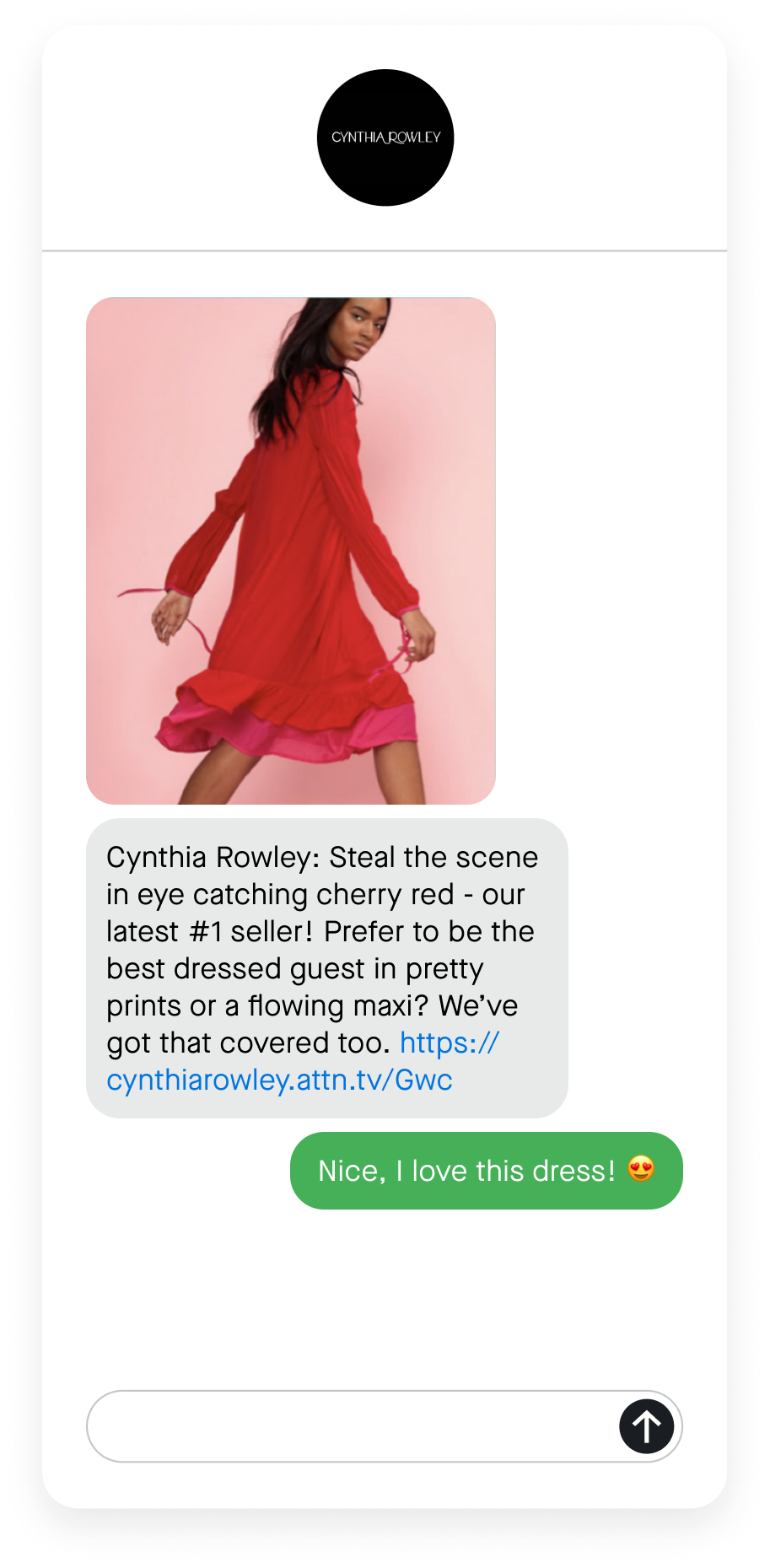 Fashion brand Cynthia Rowley used SMS to promote their best-selling dress. The message includes a vibrant image of the dress and a direct link to the product, standing out to subscribers and encouraging them to shop.