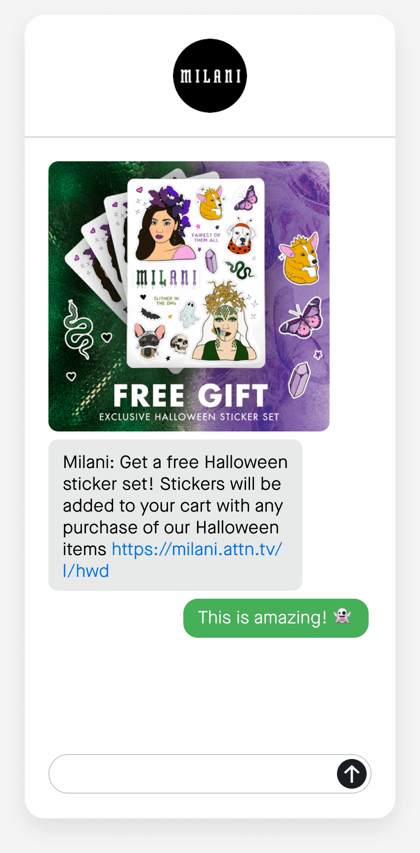 Instead of offering a seasonal discount to SMS subscribers, Milani Cosmetics boosted their Halloween revenue by offering a free sticker set with purchase. The makeup and beauty brand included a dazzling GIF of the stickers, which features spooky graphics and images of the popular beauty influencers who collaborated on the Halloween product line. They ended with a direct link, making it as easy as possible for their mobile audience to shop with just one click.