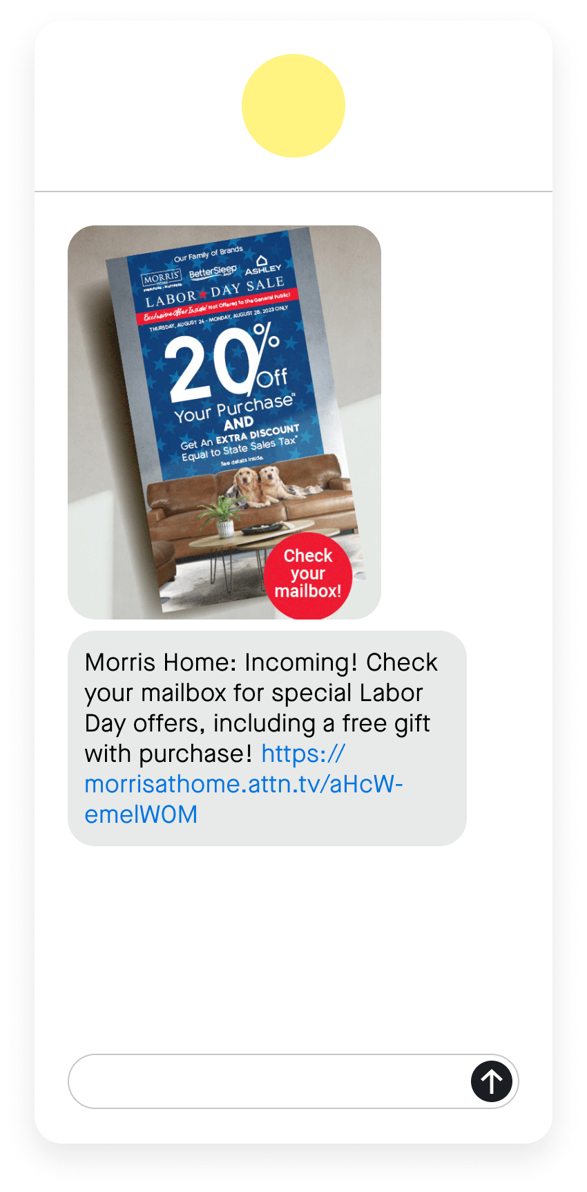 Morris Home, a furniture and home decor retailer, used MMS to let customers know about their Labor Day sale, as well as to keep a lookout for a physical coupon that would soon arrive in their physical mailbox. While customers waited for their mail, they could still browse and find the items they could then buy at a discounted price. This multi-channel approach allows for more touchpoints with customers, and opportunities to upsell or cross-sell as they browse.