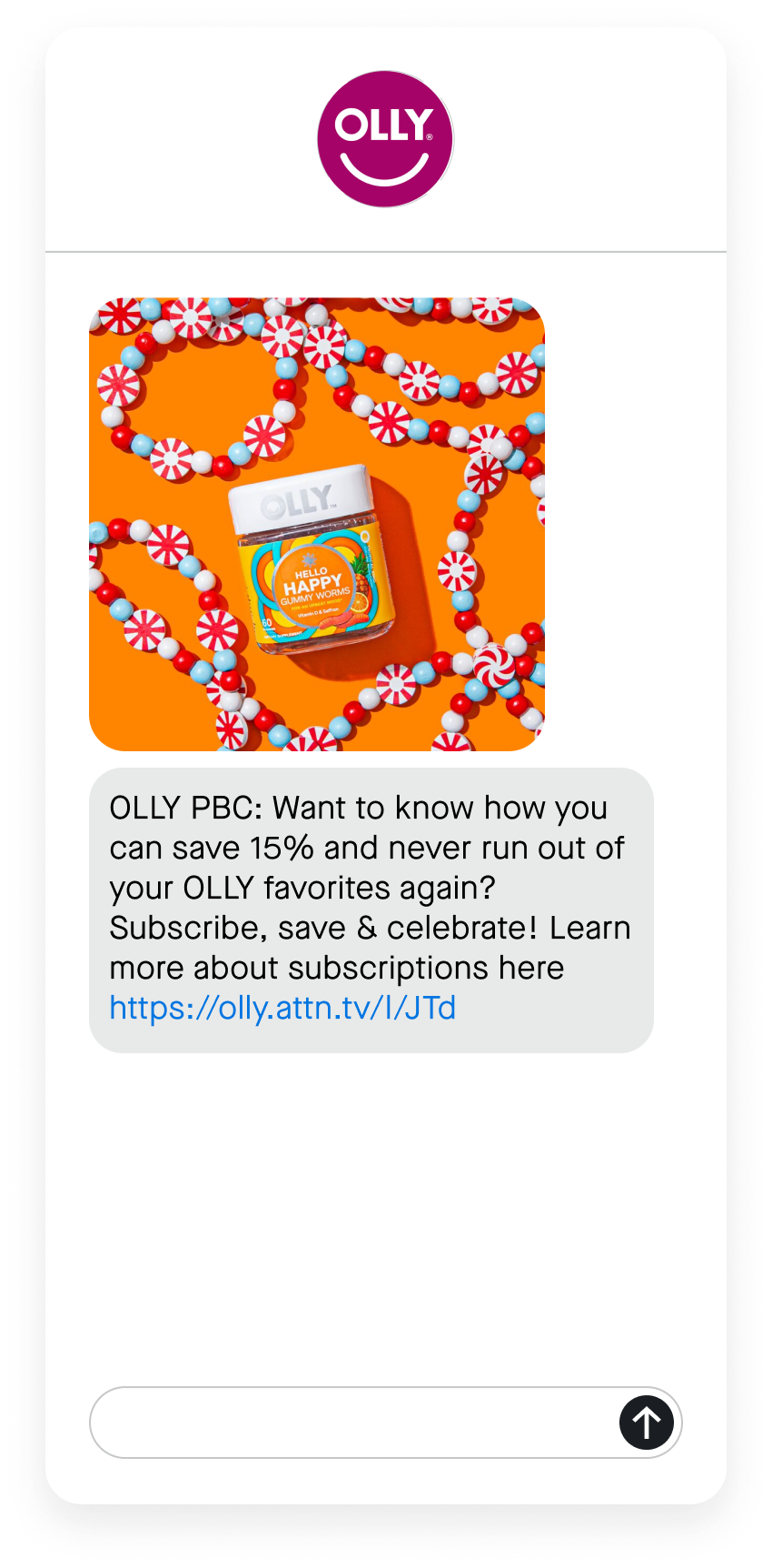 OLLY invited their SMS audience to subscribe and save on their favorite products. Since their text message subscribers are highly engaged with the brand, they’re the perfect audience for repeat order offers. The percent-off discount and direct link to “learn more” encouraged their SMS audience to “save and subscribe” to their preferred vitamins, driving incremental revenue.