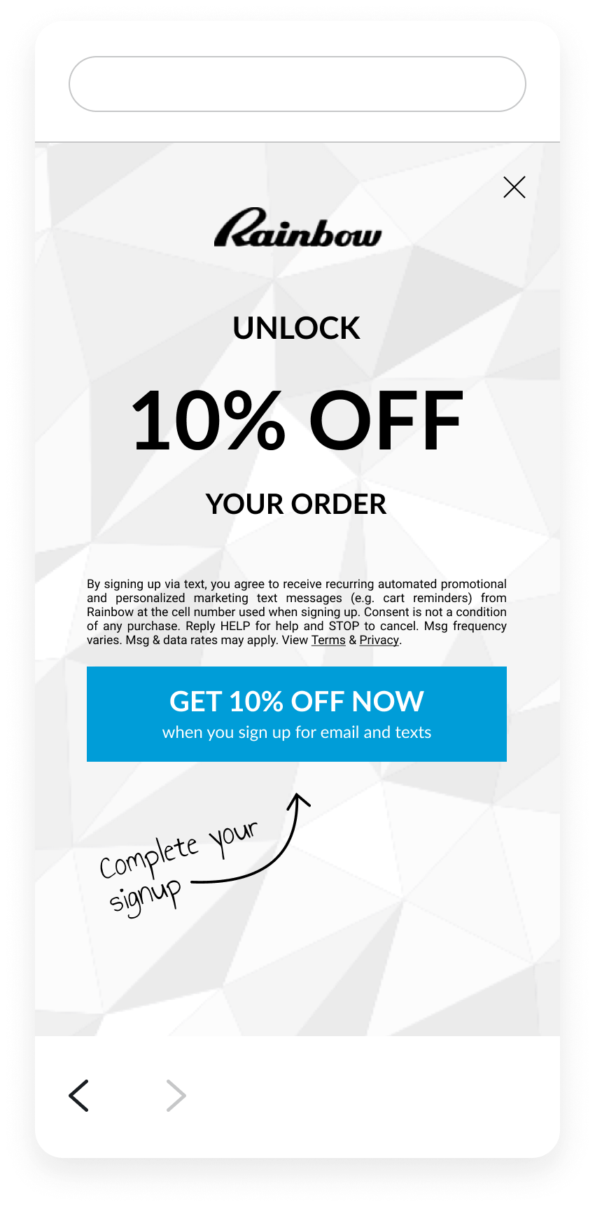 Rainbow drives text messaging and email opt-ins with Attentive’s 2-in-1 sign-up unit on its mobile website. Since the apparel brand sees 80% of digital revenue coming from a mobile device, these sign-up creatives are a great way to reach customers and engage them on their preferred platform.