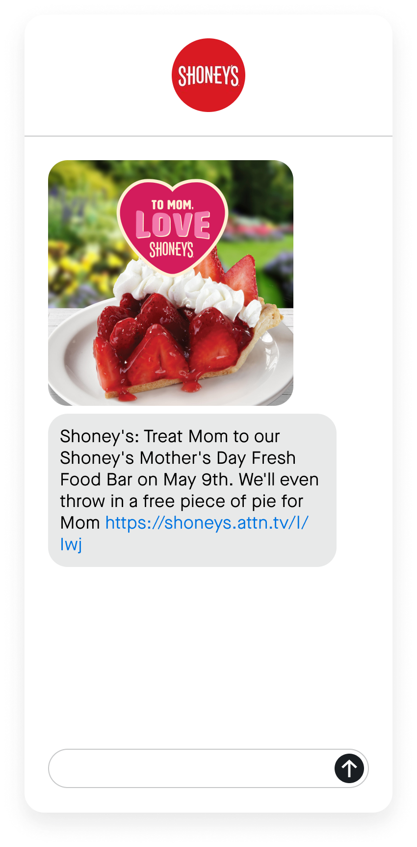 Shoney’s drove traffic to their restaurants by promoting the Mother’s Day Food Bar to their engaged SMS subscribers. They delighted subscribers with the free pie incentive, building excitement with a mouthwatering graphic. This experiential promotion stood out and inspired subscribers to spend time and enjoy a special treat with the moms in their lives.