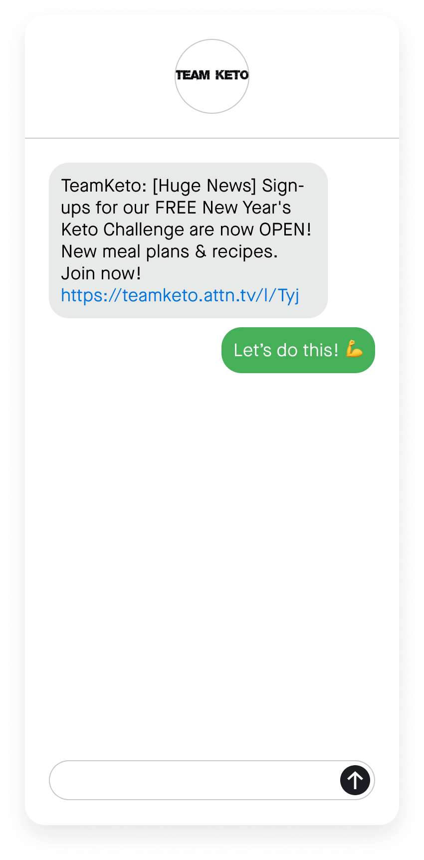 TeamKeto inspired their SMS subscribers to jump into a new healthy routine with their New Year’s Keto Challenge. Knowing that it’s easier to start new habits with a community behind you, the wellness brand united participants with a common goal. Since their SMS subscribers are highly engaged with the brand, they were the perfect audience to take on the challenge.