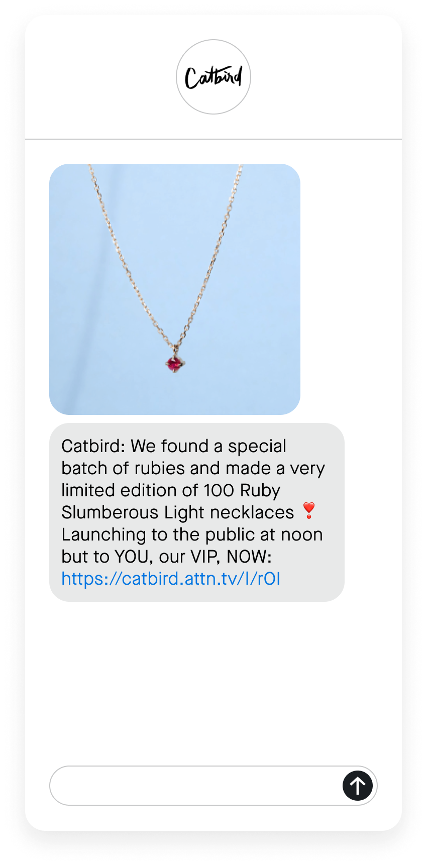 Catbird likes to send their VIPs exclusive rewards through SMS—like early access to promotions and product launches. When they released a limited edition batch of ruby necklaces, loyal customers got the chance to shop the special collection before anyone else. Strategies like this help Catbird nurture relationships with their customers and increase their lifetime value.