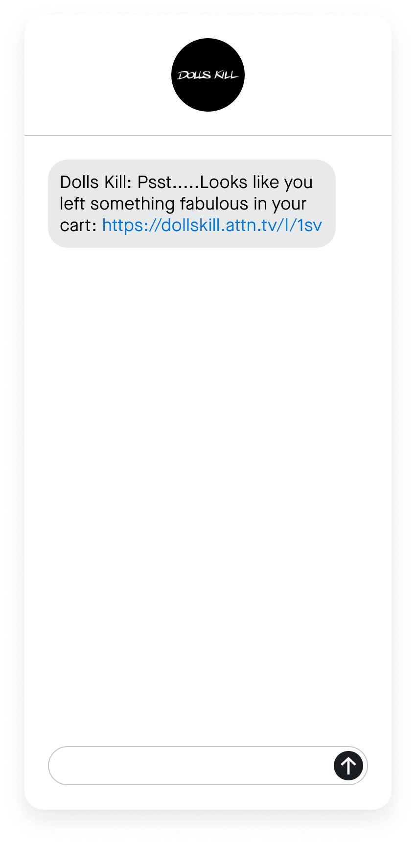 To help guide shoppers to complete their purchases, online fashion boutique Dolls Kill sends triggered cart abandonment reminders to text messaging subscribers 1 hour after they abandon their online carts. This reminder is short and sweet, but highly effective. Dolls Kill uses playful, on-brand messaging to remind shoppers that they "left something fabulous" in their online shopping cart.