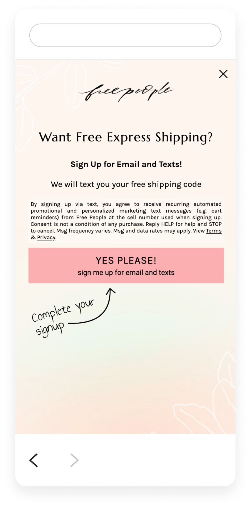 Bohemian apparel brand Free People acquires new text and email subscribers through Attentive’s 2-in-1 sign-up solution. By offering free shipping, shoppers are even more incentivized to opt in. Once the shopper inputs their email address, they are prompted to complete their sign up and receive the free shipping reward by also opting in for text messages. This marketing strategy is a powerful tool for brands to rapidly grow both email and text messaging subscribers.
