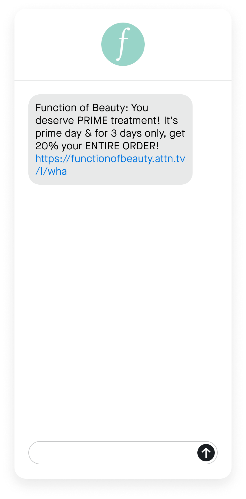 Function of Beauty knew they needed to offer something special to compete with Amazon's Prime Day deals and capture shoppers' attention. The brand launched a playful campaign to give their customers “prime” treatment—the chance to get 20% off their entire order for three days only. By aligning their sale period with Prime Day but extending it an extra 24 hours, Function of Beauty was able to get the most out of the shopping holiday and maximize their revenue.