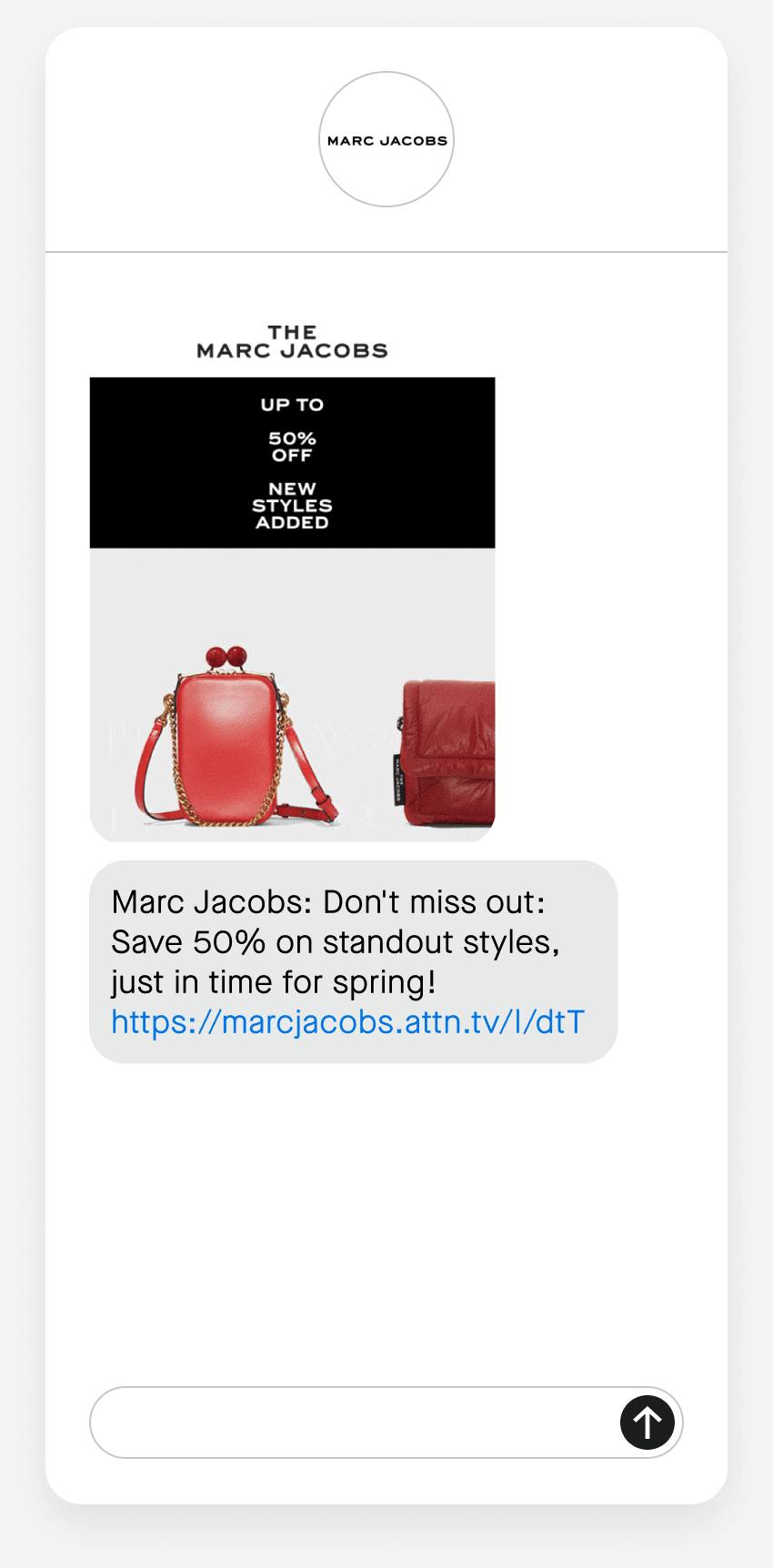 Luxury fashion brand Marc Jacobs used text messaging to alert shoppers of new sale items. The text message included a custom animated GIF which featured a sneak peek of the new styles. The text message copy complements the graphic by stating the discount that shoppers could expect to receive. The urgency of the copy (“Don’t miss out”) combined with the mention of “standout styles” is the perfect way to excite shoppers about the new spring collection and encourage them to shop.