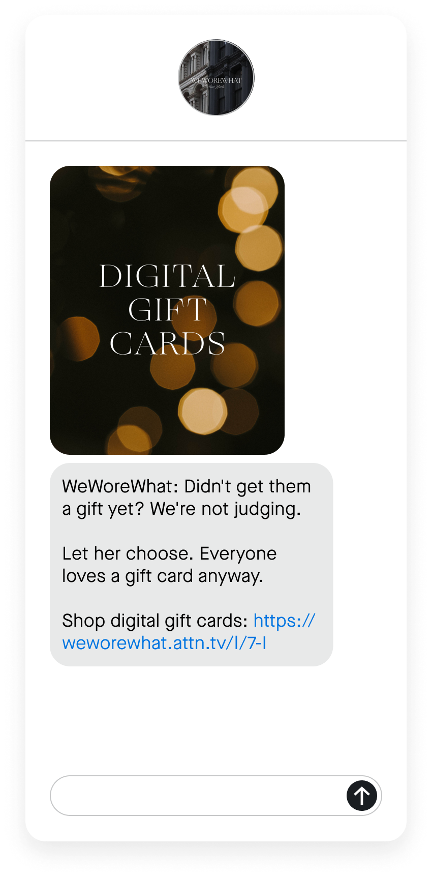 On Christmas Eve, WeWoreWhat captured holiday revenue from their SMS audience by sharing the perfect holiday present for last-minute shoppers: a digital gift card! The direct link made it easy for subscribers to shop the gift cards and “let her choose,” spreading both holiday joy and brand awareness.