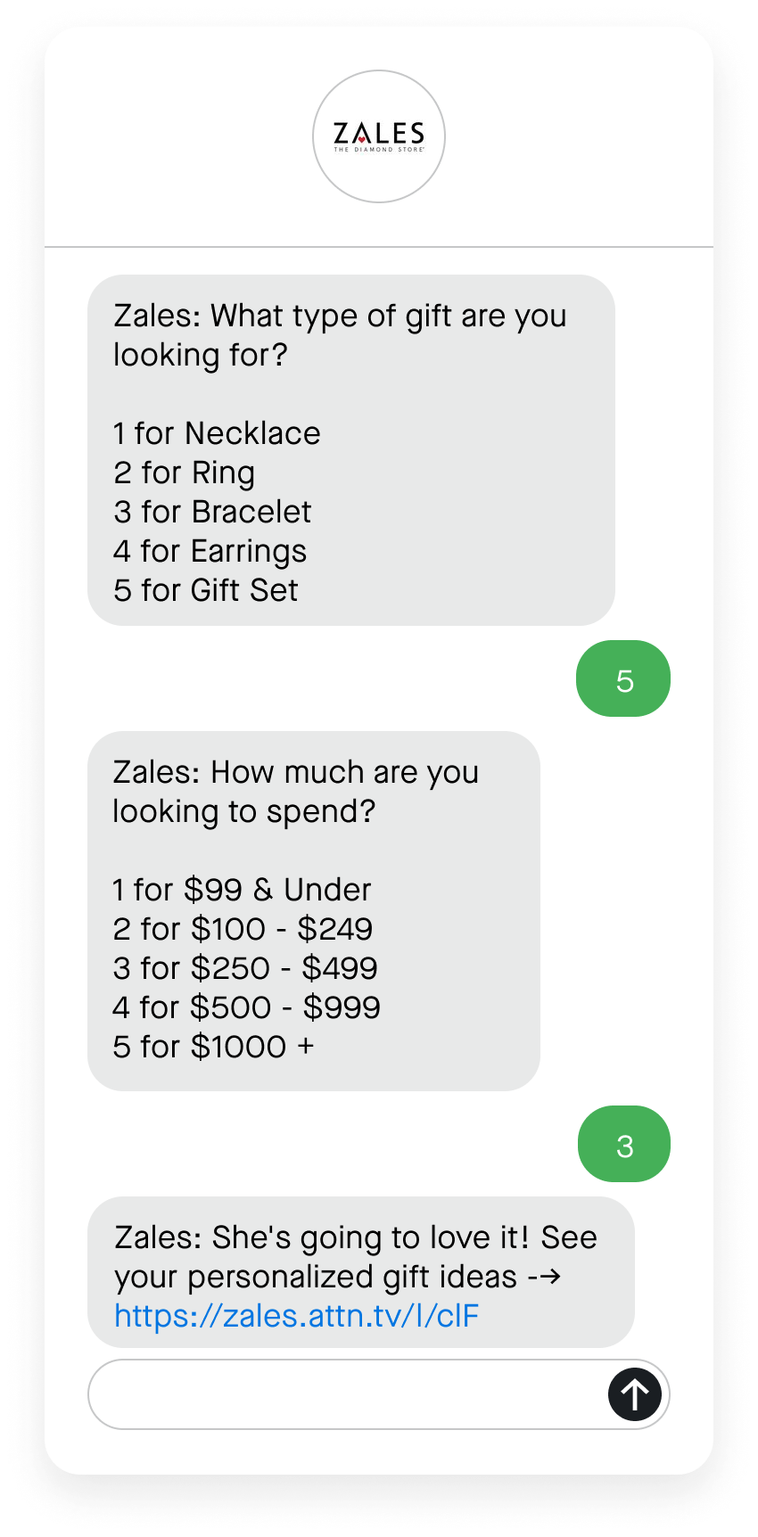 Zales recommends personalized gift ideas to new subscribers using Attentive’s Two-Way Journeys™. This conversational strategy helps Zales drive online revenue by imitating their in-store product discovery experience. They can also add these preferences as “custom attributes” to each subscriber’s profile, helping them deliver relevant messaging throughout the entire customer lifecycle.