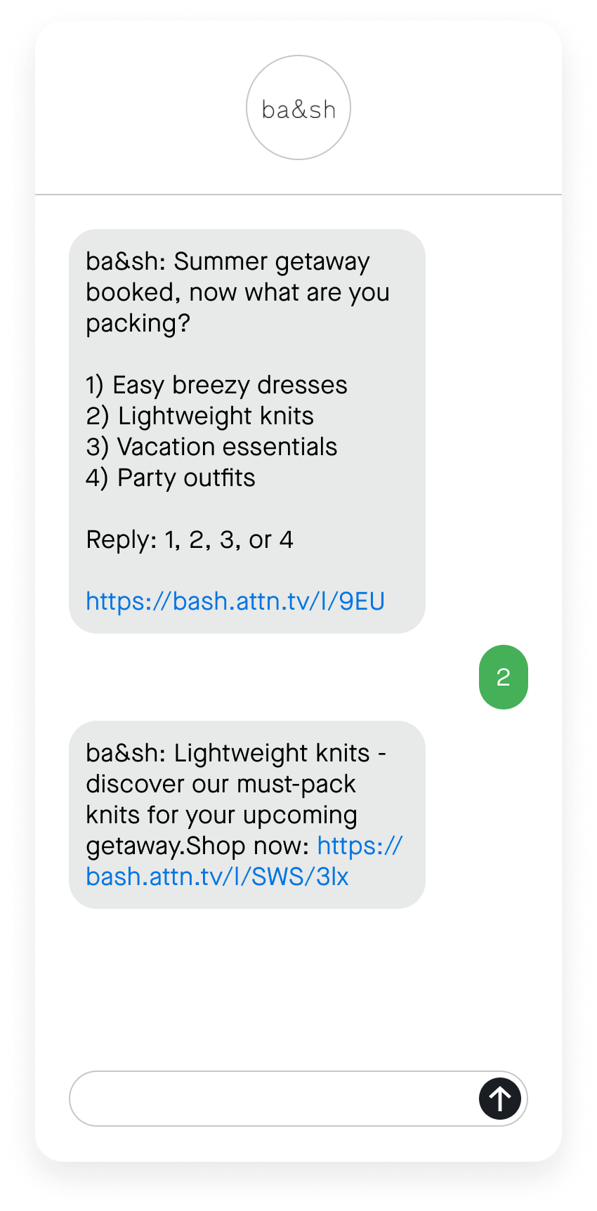 Fashion brand ba&sh used Attentive's Two-Way Journeys™ to collect customer preferences during the busy summer travel season. The conversational campaign asked subscribers to share which type of clothing they're interested in purchasing and packing for a trip. This strategy gives the brand psychographic profile insights to segment customers and engage them with relevant, targeted offers in the future.