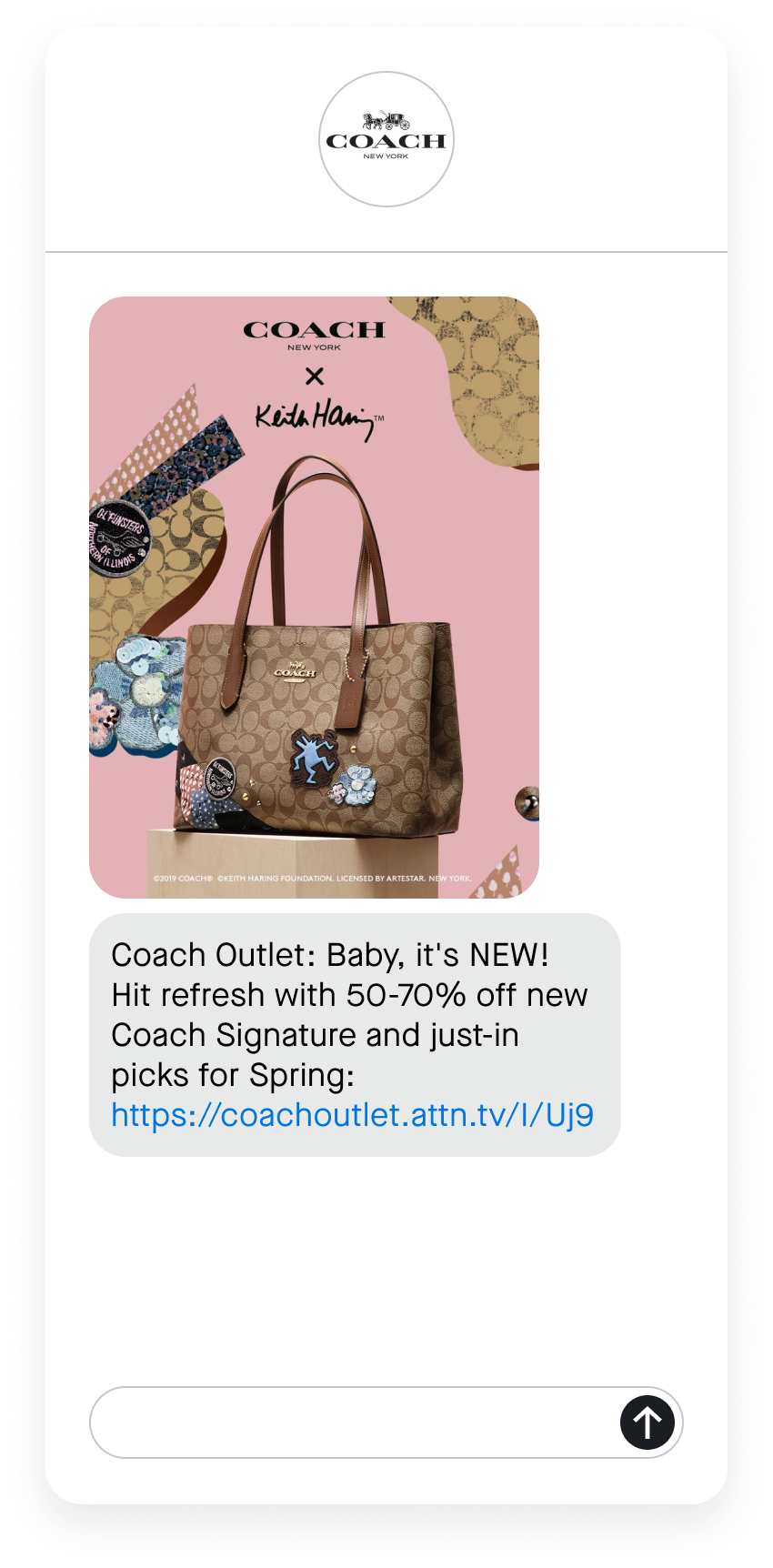 Luxury fashion brand Coach alerted outlet shoppers of new items for spring by sending a timely and visually appealing text message. The pink graphic with the Coach logo, the new “Coach X Keith Haring” purse, and floral accents gives the message a spring feel. The warm tone of the message copy (“Baby, it’s NEW!”), combined with the mention that these items just arrived, is the perfect way to excite Coach shoppers about the new spring collection.