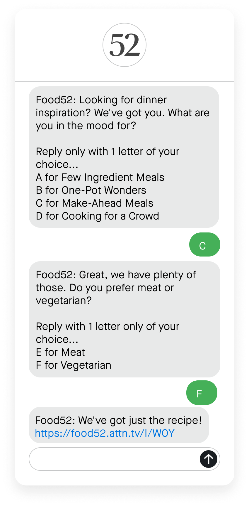 After a new subscriber joins Food52’s SMS channel, the brand recommends personalized recipe ideas using Attentive’s Two-Way Journeys™. The back-and-forth flow asks about the subscriber's food preferences and “mood,” then automatically shares a direct link to the relevant recipe. This conversational strategy helps subscribers quickly discover new recipes, and encourages them to learn more about the brand and explore their products.