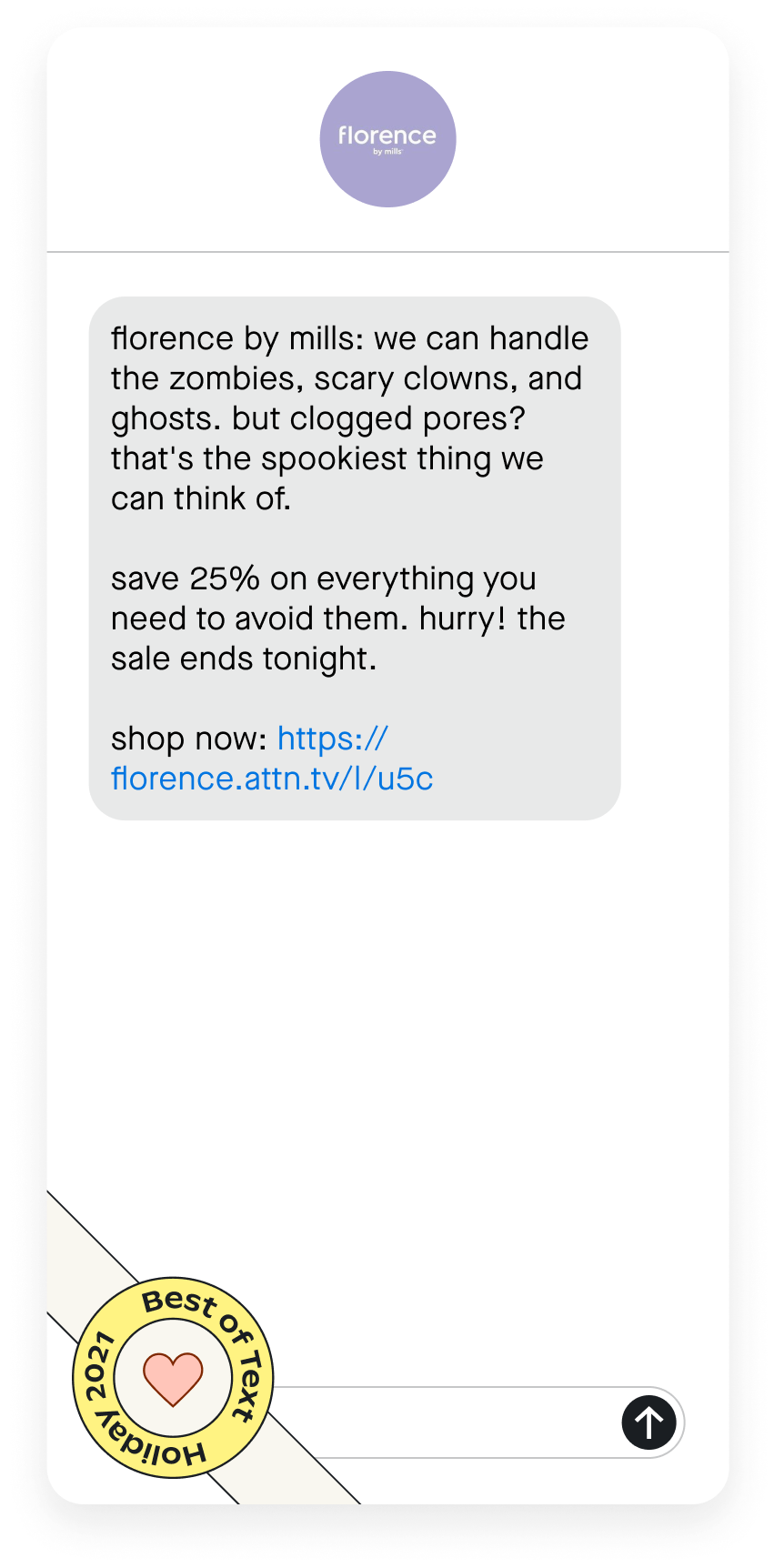 Florence by mills’s clever Halloween campaign painted a funny and relatable moment for their subscribers, standing out as the winner of the “Jolly Award” in our Best of Text: Holiday 2021 Edition. The relevant messaging highlighted their unique brand voice with a spooky spin, encouraging subscribers to take advantage of the limited-time sale and stock up on skincare.