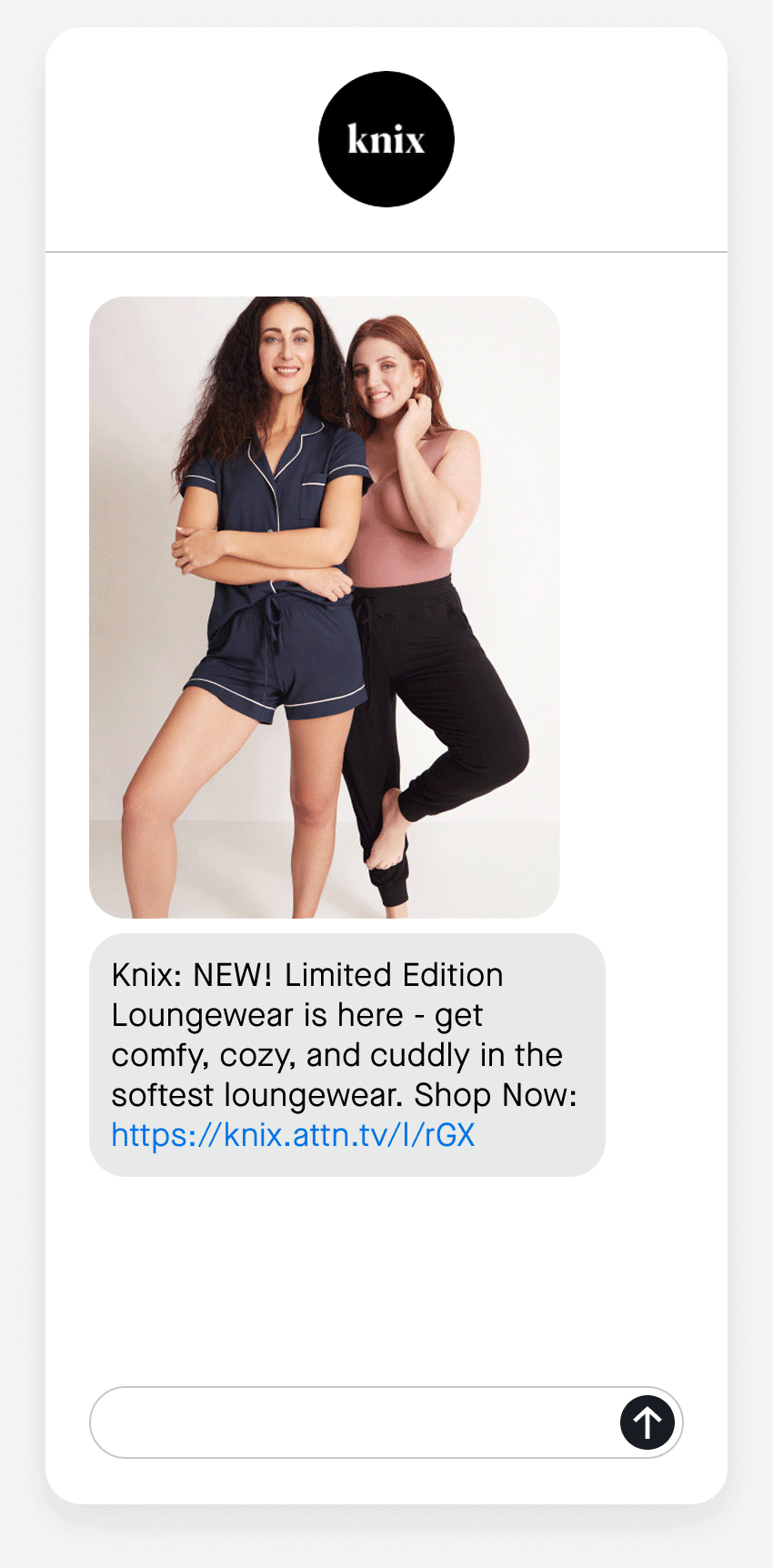 Intimates apparel brand Knix texted subscribers about their new, limited-edition product launch. The brand included a GIF that offered a sneak peek of the new loungewear, and they ended the text message with a direct link to shop the new line. Including a sneak peek of the “comfy, cozy and cuddly” new line, and highlighting the limited edition nature of the product, excites subscribers and encourages them to be the first to shop the new collection.