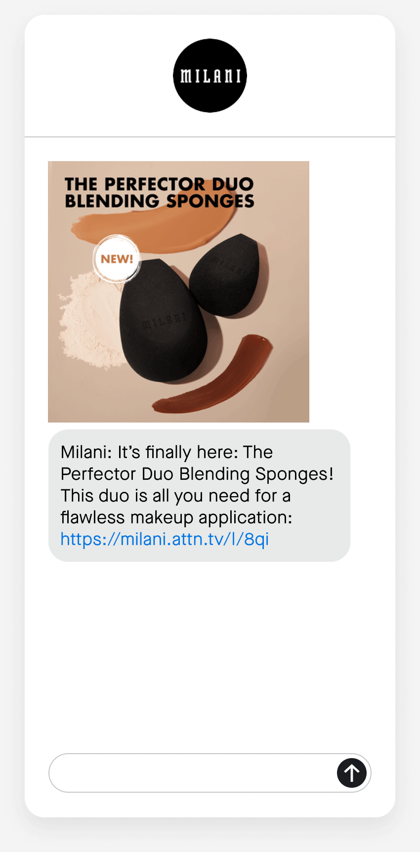 Beauty brand Milani Cosmetics texted subscribers about a much-anticipated product launch. The brand included a playful GIF featuring the newly released item and inclusive makeup shades—helping subscribers feel represented—paired with compelling copy that this is “all you need for a flawless makeup application.” Letting loyal SMS subscribers be the first to know about new items helps create hype for the new product while driving more immediate traffic to your online store.