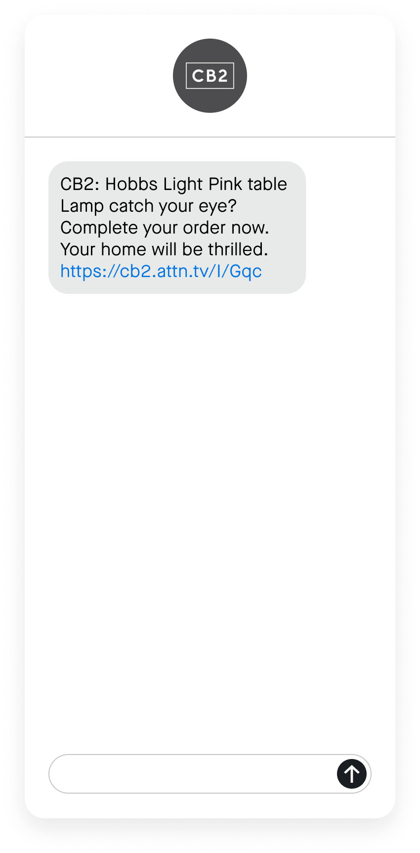 A well-timed reminder is an effective way to re-engage high-intent shoppers and remind them what they left behind. Modern home decor brand CB2 sends triggered abandoned cart reminders via text messaging. CB2 personalizes their abandoned cart reminders at scale by including a photo of the product with the message. The text copy itself uses an engaging brand voice, includes the product name, and serves as a useful reminder of how well the item would fit into the consumer’s home.