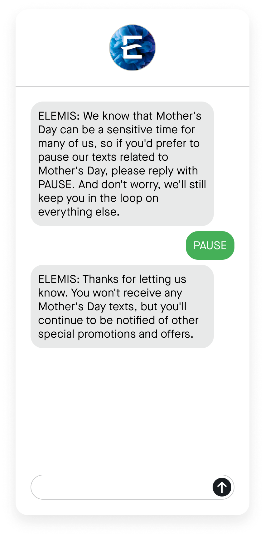 ELEMIS leads with empathy around Mother's Day by offering subscribers the option to opt out of receiving messages related to the holiday. But the brand also makes sure to keep those who've opted out updated on other special promotions and offers they may be interested in. That way, they can stay in the loop and still shop for themselves, if they need to stock up on essentials, or want to try out some new skincare.