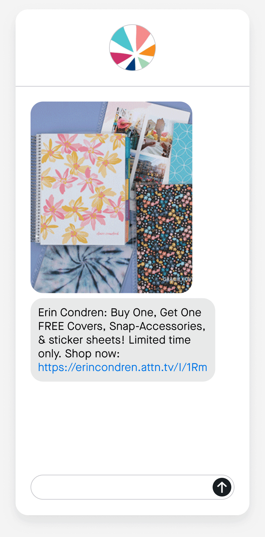 Lifestyle brand Erin Condren Designs texted their subscribers about an exciting “buy one, get one free” deal. The brand highlighted the limited-time nature of the offer to encourage subscribers to take advantage of the deal right away. Pairing the text message with an eye-catching GIF highlighting popular products helps create a consistent brand identity across digital channels in addition to providing a preview of the items included in the BOGO offer.