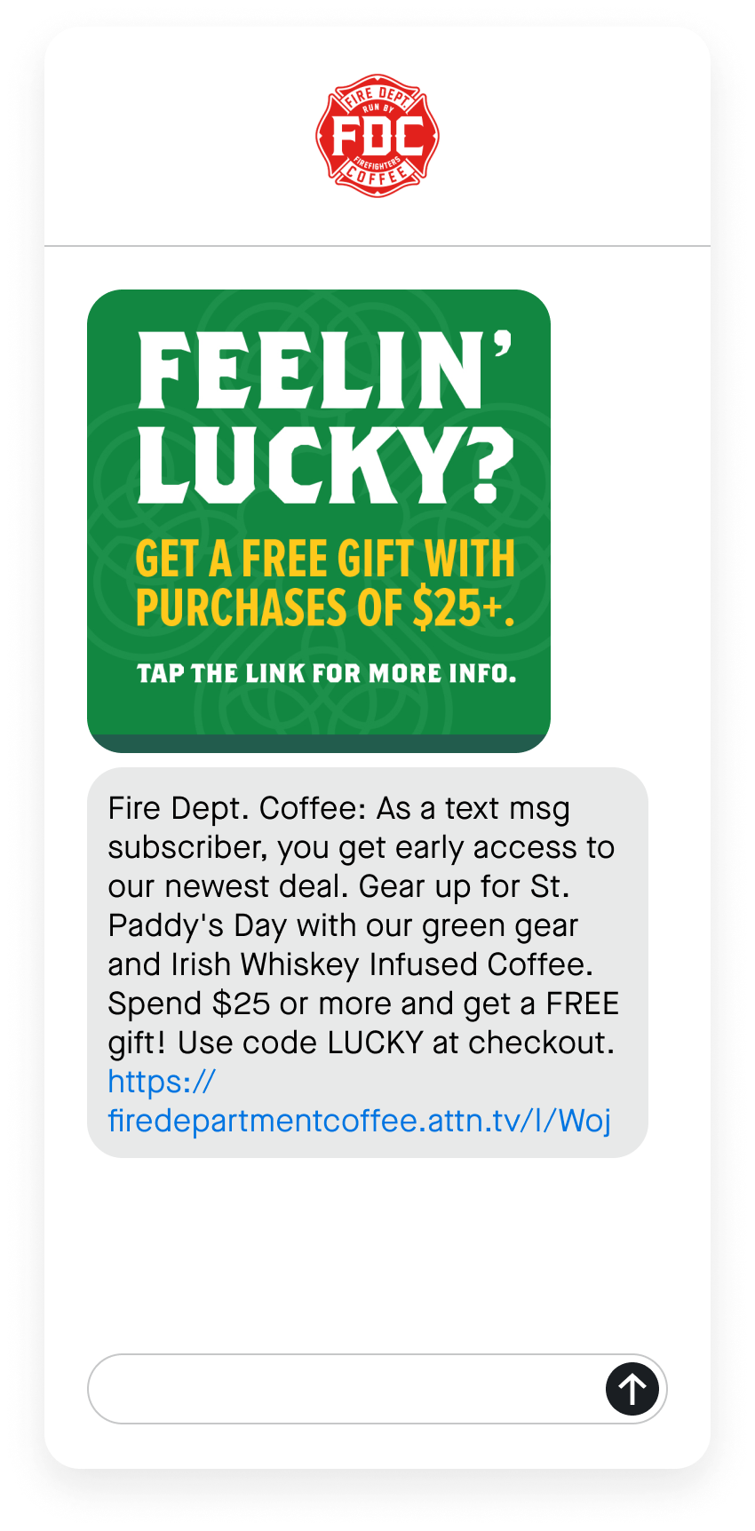 For St. Patrick’s Day, Fire Department Coffee gave SMS subscribers early access to their seasonal deals. They emphasized the early offer’s exclusivity (“As a text msg subscriber”) to make subscribers feel special and more connected to the brand. The punny graphic (“Feelin’ Lucky?”) reiterated the clear call to action, driving immediate mobile revenue.