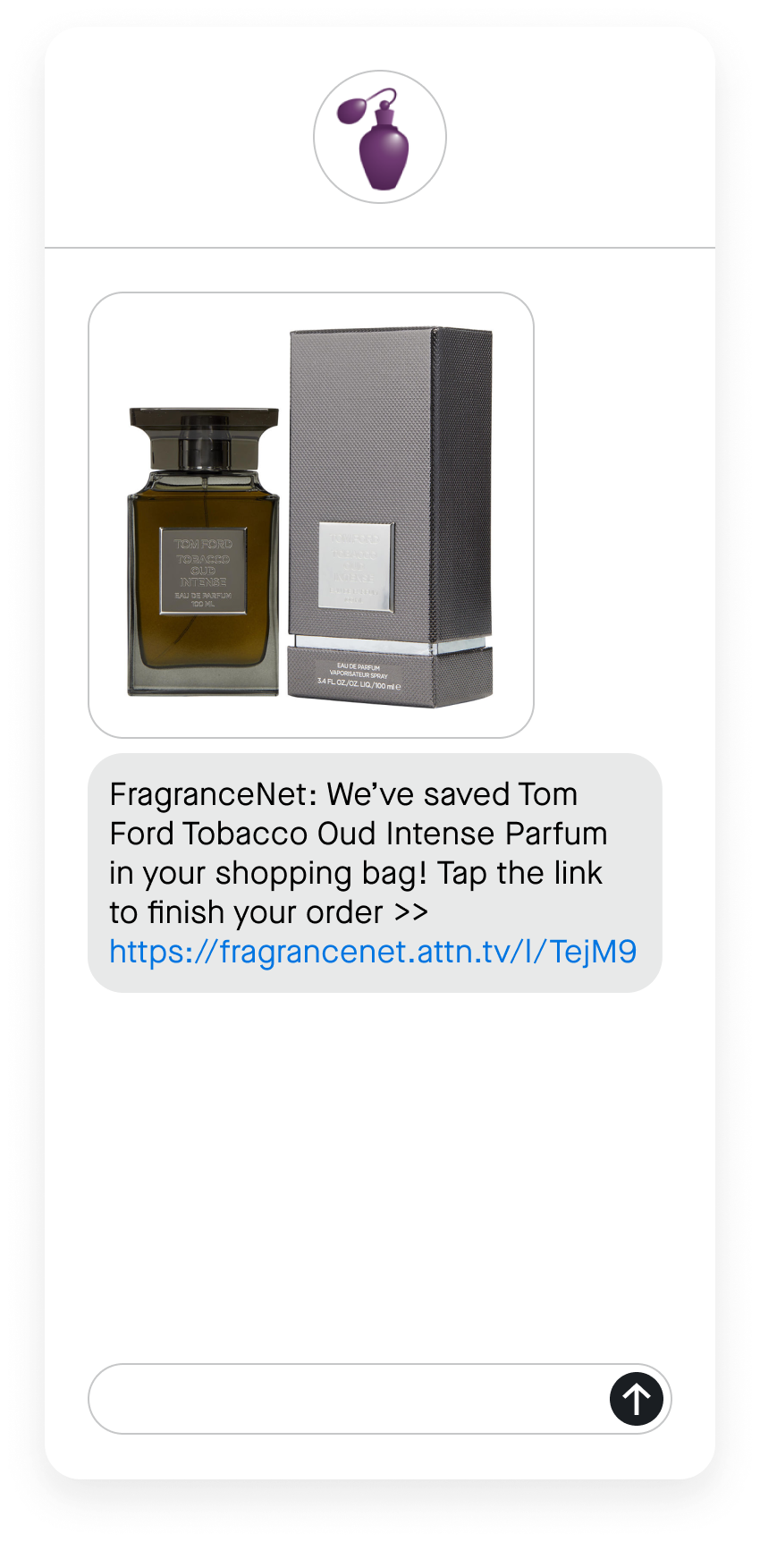 Online perfume retailer FragranceNet uses Attentive’s Journeys functionality to send automated cart abandonment reminders to text messaging subscribers 30 minutes after they abandon their online cart. The instantaneous nature of text messaging means shoppers will see the message and complete their purchase quickly. And, sharing a picture of the item the shopper was considering purchasing helps provide a touch of personalization, while helping visualize the product they left behind.