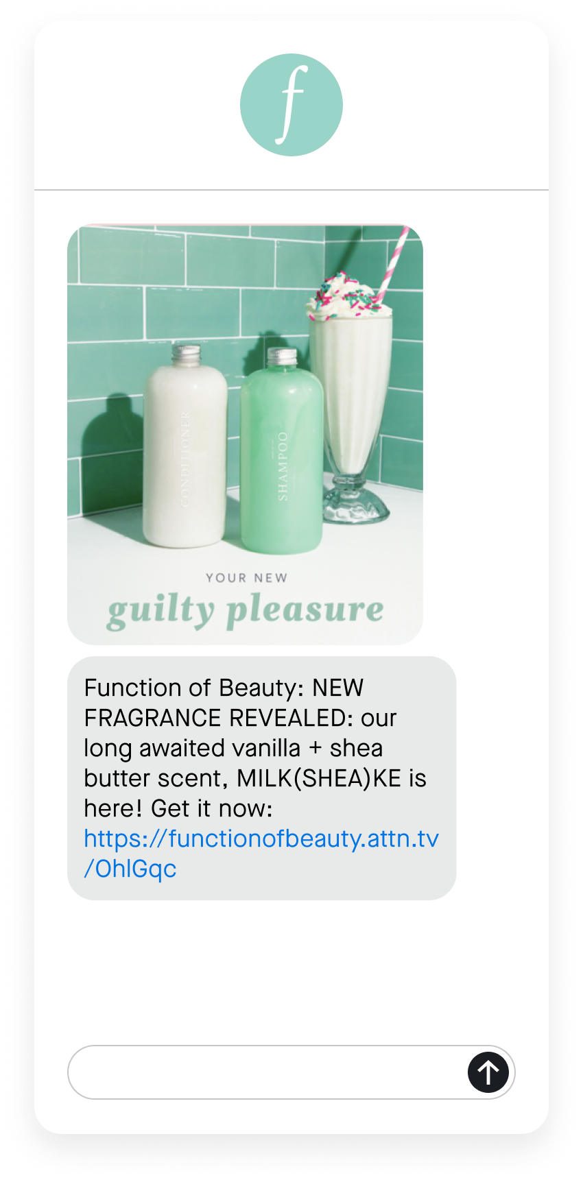 Personalized hair care brand Function of Beauty sent a text message revealing a new limited-edition fragrance. The message ended with a direct link to the product, making it easy for subscribers to add the items to their carts. By giving subscribers a first look, Function of Beauty created excitement and a sense of exclusivity. And the sense of urgency conveyed in the messaging (”long-awaited" and "get it now") encouraged subscribers to shop the in-demand product before it’s gone.