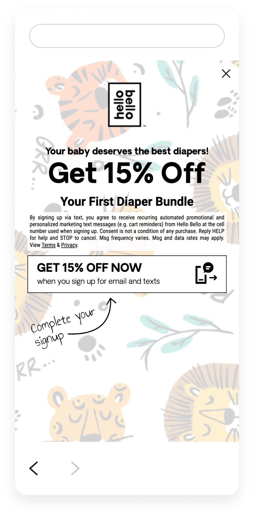 Hello Bello—a plant-based brand of baby products founded by actors Kristen Bell and Dax Shepard—acquires new subscribers through Attentive’s 2-in-1 sign-up feature. After a shopper enters their email address on Hello Bello’s mobile site, they are then prompted to complete their sign up to receive 15% off their next diaper bundle by opting in for text messages. This allows Hello Bello to seamlessly collect both emails and text subscribers in just a few simple steps.