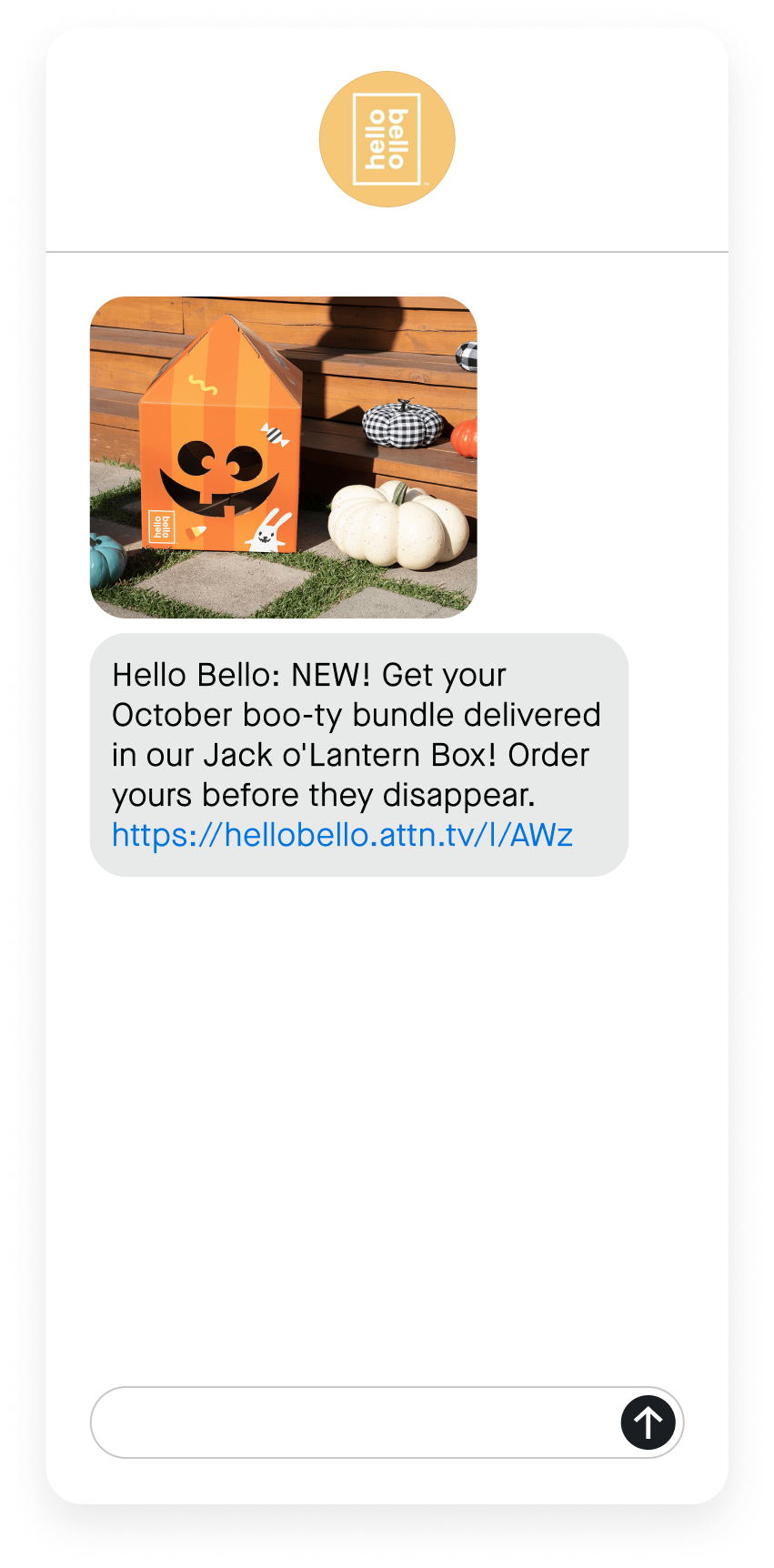 Plant-based baby products brand Hello Bello promoted their Halloween-themed diaper bundle subscription box to text messaging subscribers. They included a “spook-tacular” image of the Jack o’Lantern box to play into the seasonal theme. Hello Bello ended the text message with an urgent call to action (“Order yours before they disappear”) and a direct link to shop the bundle.