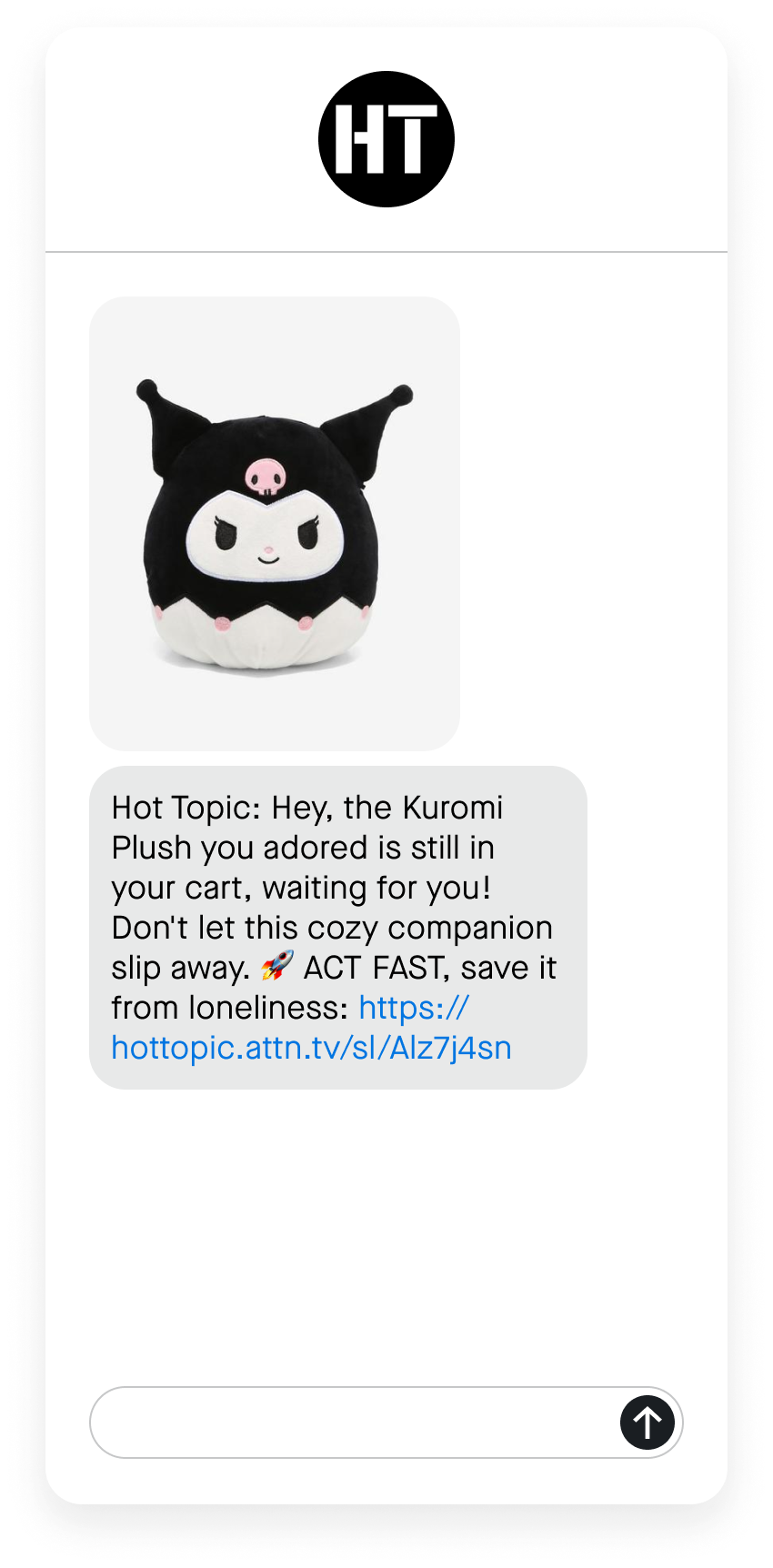 Hot Topic uses Attentive Concierge™ powered by Attentive AI™ to make sure incoming messages are never left unread. When subscribers reply to campaigns or abandonment messages with comments like, "Yeah, but you don't have my size," conversational AI is there to help. It can recommend a nearby store or suggest other items available in the customer's size. AI-driven support via SMS not only extends the bandwidth of in-house CX teams, but it also improves response times and customer satisfaction rates.