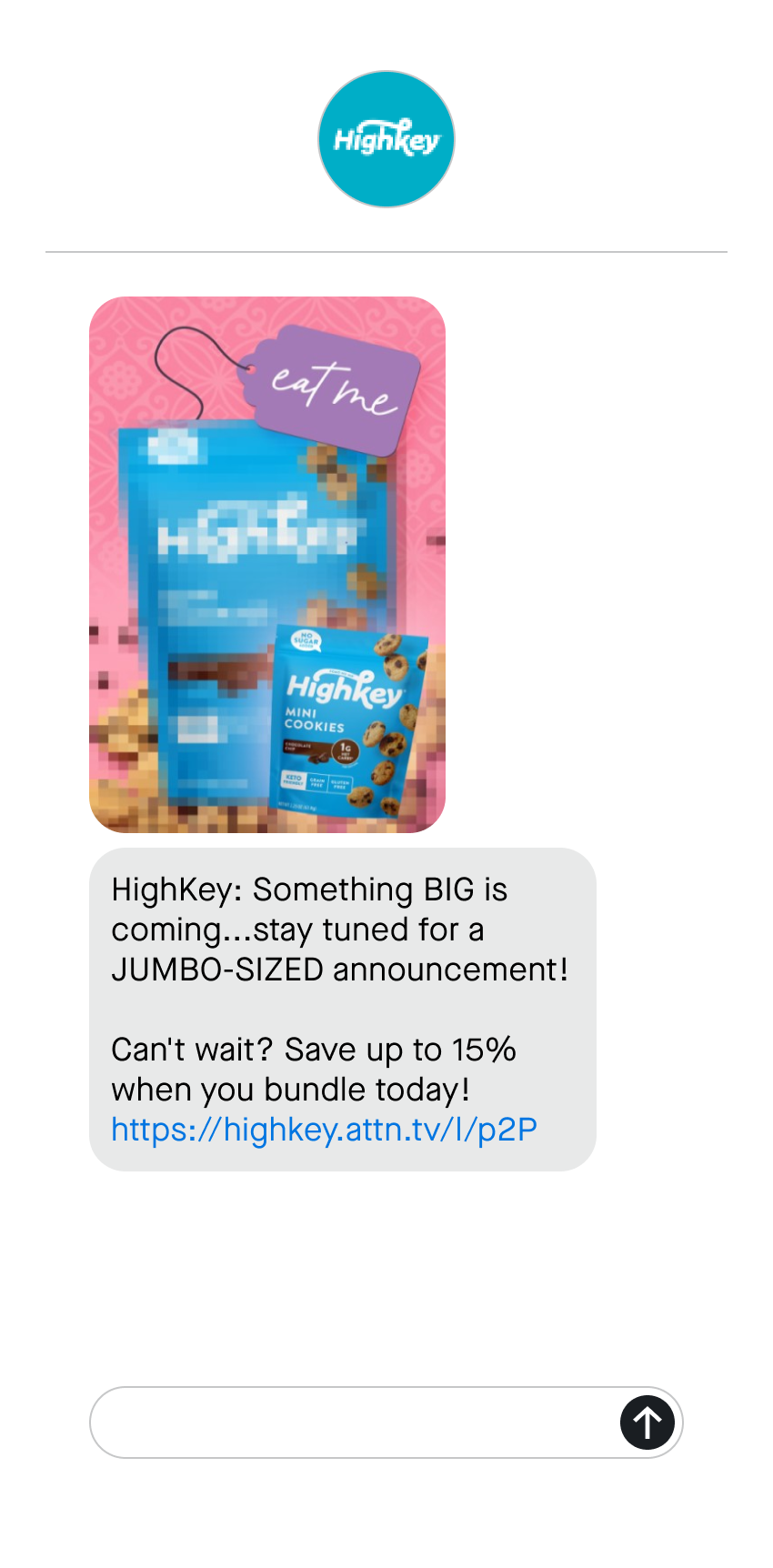 Healthy snack brand HighKey sent a playful text message teasing their "JUMBO-SIZED" announcement. They blurred out part of the picture to keep their announcement a secret, while still giving subscribers a sneak peek at what was coming. The brand also included a 15% off discount in case subscribers couldn't wait. HighKey then followed via SMS up a couple of days later to officially let subscribers know they could purchase jumbo-sized bags of their popular mini cookies.