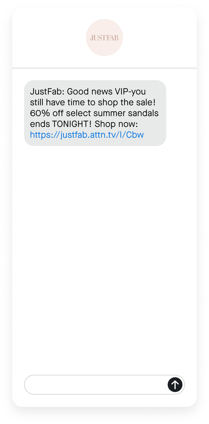 Subscription fashion retailer JustFab sent VIP text messaging subscribers an offer to shop an exclusive 60% off sale before it ended. In the text message, JustFab highlighted the limited-time nature of the sale (“ends TONIGHT!”) and reminded subscribers of their “VIP” status. Customers love to feel like they’re receiving VIP treatment and exclusive perks. Sending VIP reminders about limited-time sales is an effective way to engage high-value customers.
