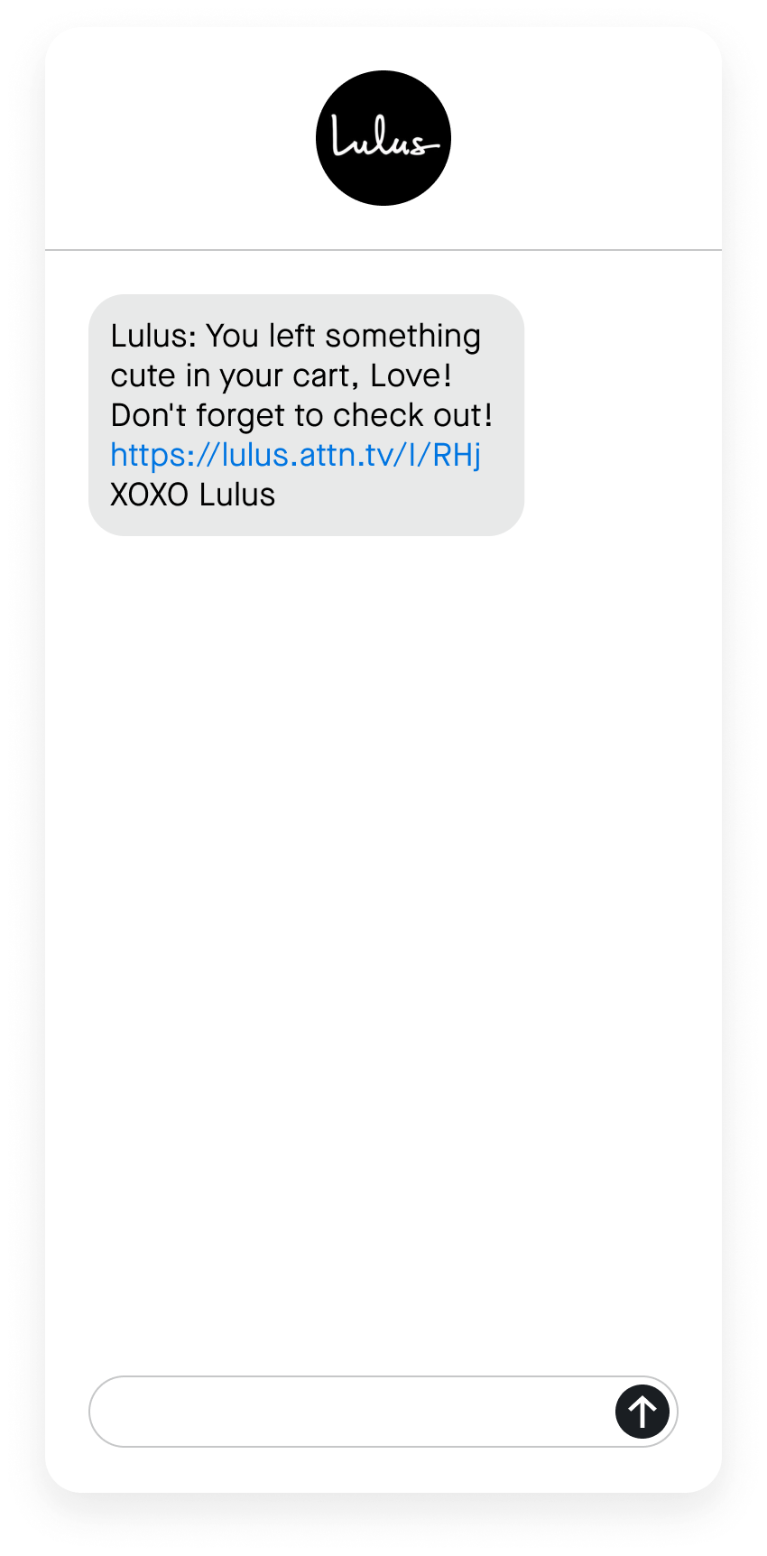Trendy global fashion brand Lulus sends triggered abandoned cart reminders via text message. Lulus conveys its brand voice by personalizing the message with a playful tone, “you left something cute in your cart, Love!”. This message allows the brand to automatically drive revenue by bringing shoppers back to their online carts, in a way that is perceived as a helpful reminder. By sending a message that will be seen immediately, Lulus effectively retargets customers and recovers sales.