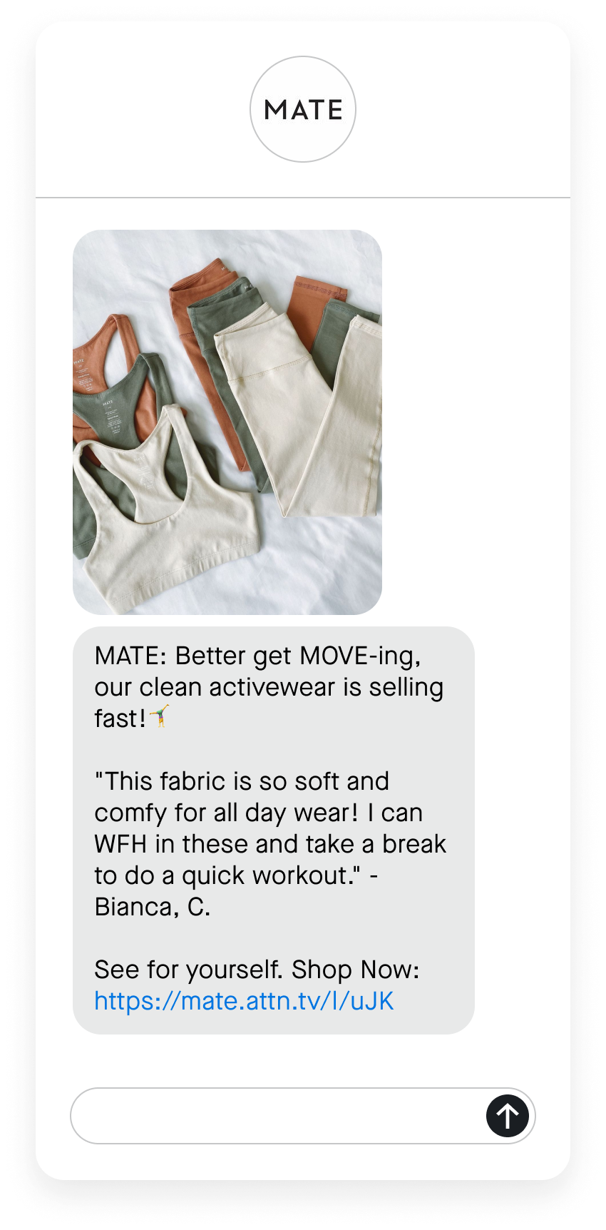 Sustainable clothing brand MATE the Label texted subscribers to promote their popular activewear collection. They maintain their approachable brand voice while using a sense of urgency in the copy (“get MOVE-ing” and “selling fast”). The brand also included a positive product review, knowing that shoppers trust what other customers say. After A/B testing this message, MATE the Label saw the performance advantages of the customer review and implemented it across their channels.