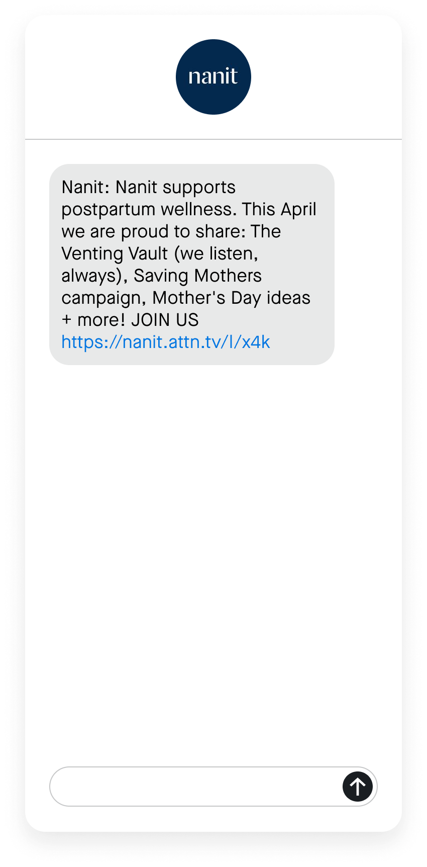 Nanit knows that many of their customers are moms themselves, so they made their Mother's Day campaign all about offering them tangible support. The brand used their SMS channel to share postpartum wellness resources like their Venting Vault, a safe space to connect with other parents, and highlight their partnership with Saving Mothers. By engaging their community in an authentic and meaningful way, Nanit made sure the moms in their audience felt truly appreciated.
