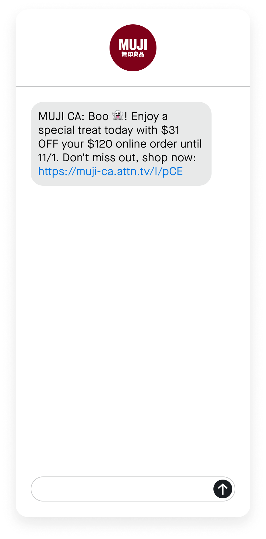 MUJI takes a subtle but effective approach to celebrating holidays with their SMS audience. On Halloween, the brand treated their subscribers to a not-so-scary surprise—the chance to get $31 off their orders of $120 or more for a very limited time—creating a sense of urgency for them to shop on October 31.