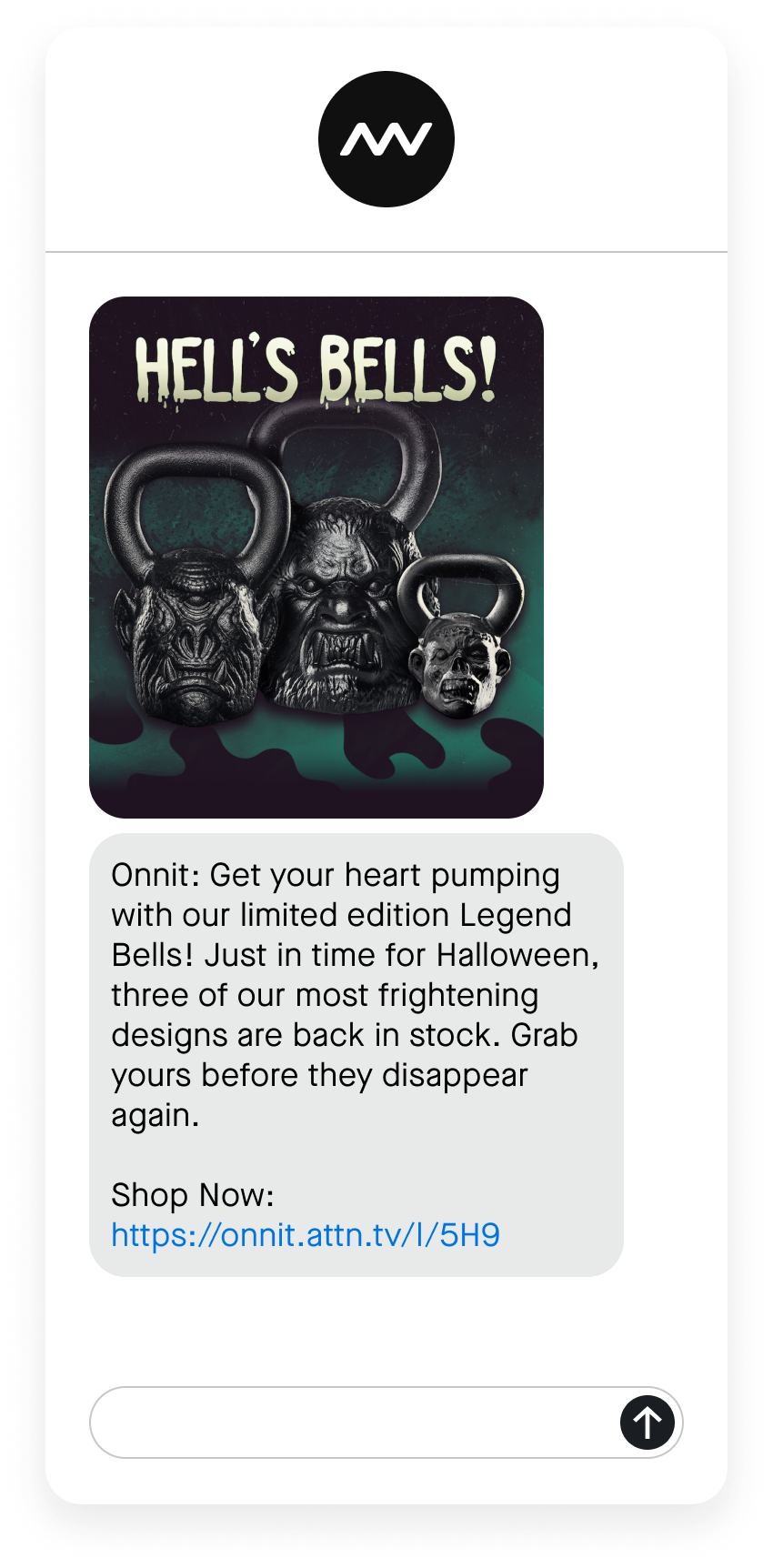 Onnit's customers love their limited-edition “Legend Bells” featuring fun and frightening monster-inspired designs. Onnit leveraged Attentive's "Has Replied Keyword" feature to promote the collection, which allowed them to directly message hundreds of customers who had previously asked about kettlebells. In tandem with Onnit's vibrant imagery, their campaign drove over $15K in revenue without featuring any discounts.