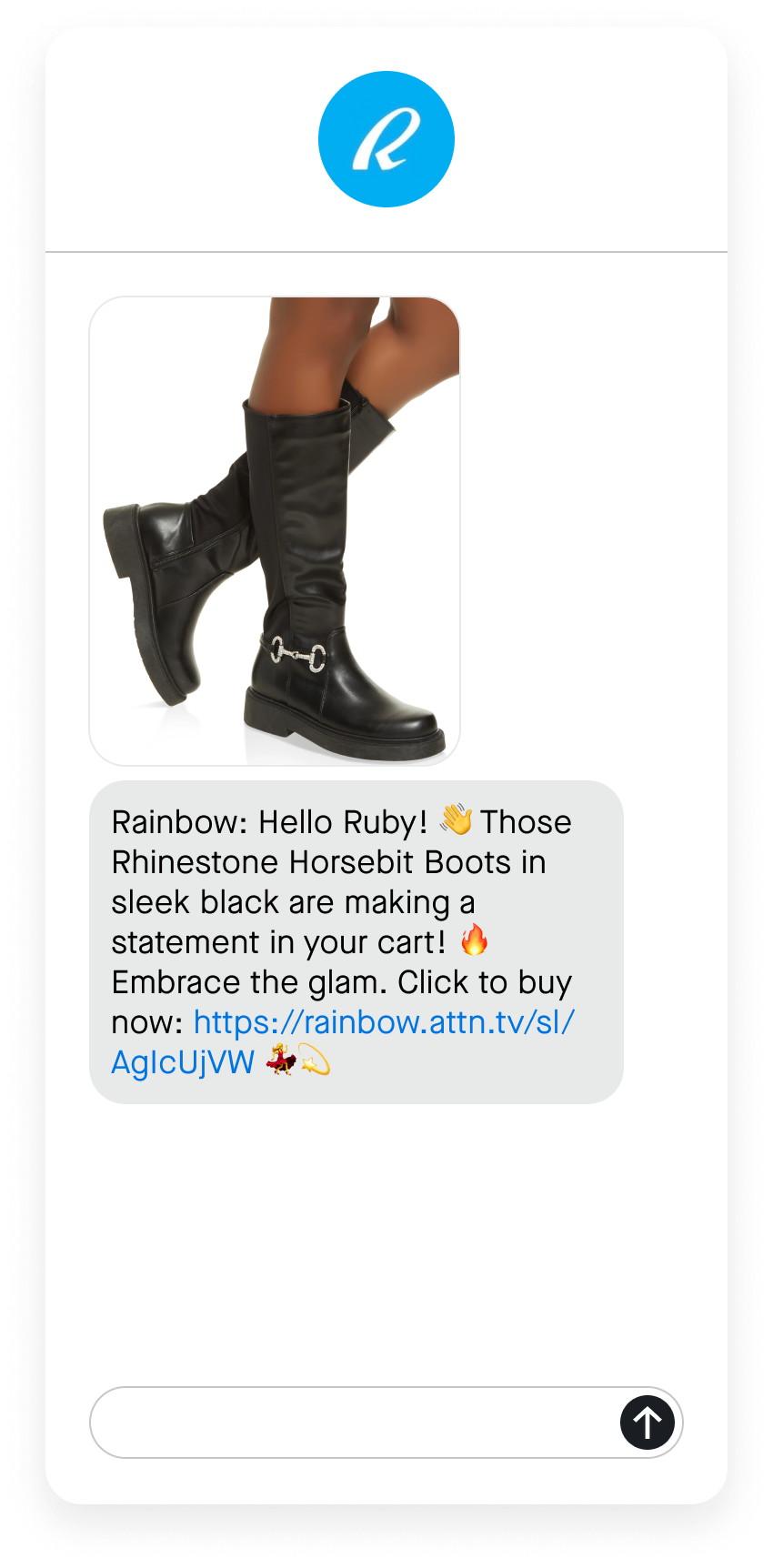 Rainbow uses AI Journeys to automatically personalize their triggered cart abandonment messages in real time. Instead of sending the same "Hey, you left something cute in your cart" reminder to everyone, Rainbow can now send each customer a unique text, just like the one Ruby got. With the help of AI, Ruby's message was tailored based on the specific products in her cart and was sent at the perfect time, based on her specific behavior patterns, increasing the likelihood of a conversion.