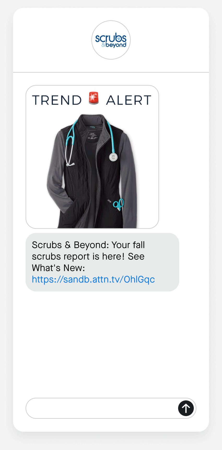 Healthcare apparel brand Scrubs & Beyond alerted text messaging subscribers about new seasonal arrivals. Calling attention to “what’s new” through a text message is an easy way to send relevant content to subscribers who are eager to hear new updates from a brand. Additionally, this approach opens up an opportunity for Scrubs & Beyond to send this type of message as an ongoing seasonal campaign to excite shoppers with new “trend alerts” throughout the year.