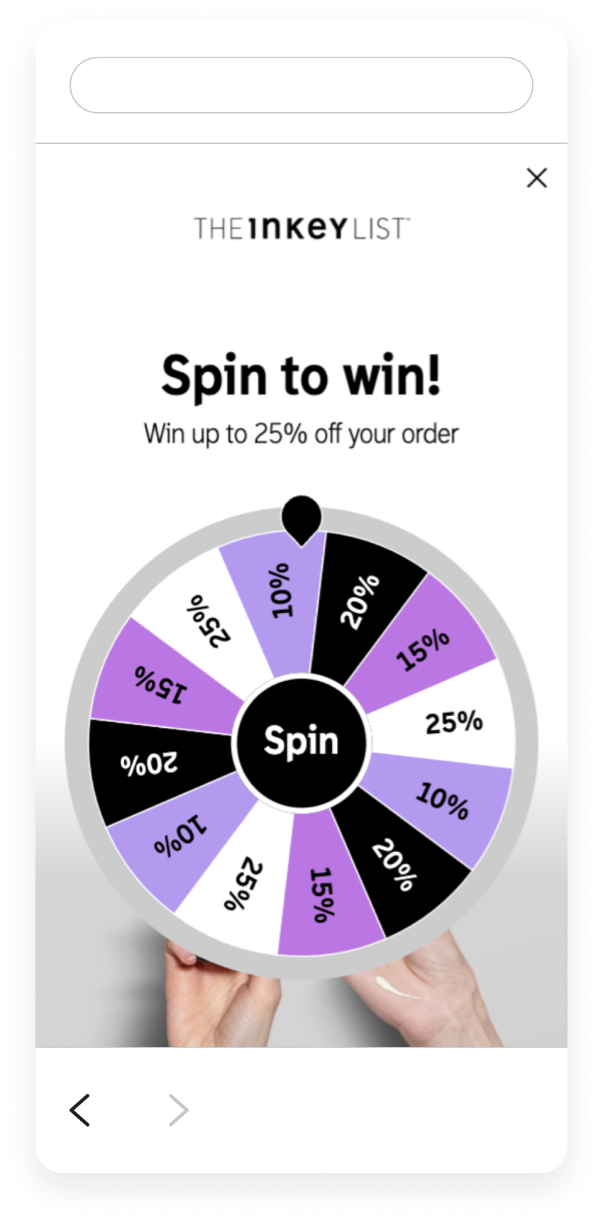 The INKEY List launched a Spin-to-Win sign-up unit around Black Friday and Cyber Monday to grab shoppers' attention and encourage conversions with a fun reward. Visitors could spin the wheel to win up to 25% off their order. After opting in to both email and SMS, the brand automatically sent subscribers a welcome message with their discount code. The gamified experience also helped The INKEY List grow their subscriber base.