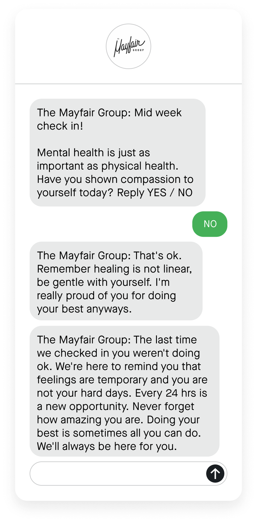 The Mayfair Group strengthened their SMS subscriber community with this non-promotional check-in. This simple yes/no question showed that they care about their customers and adds a human touch with the two-way conversation. A few days later, Mayfair sent this follow-up message to the subscriber segment that responded with “NO,” showing how they value and want to support their subscribers.