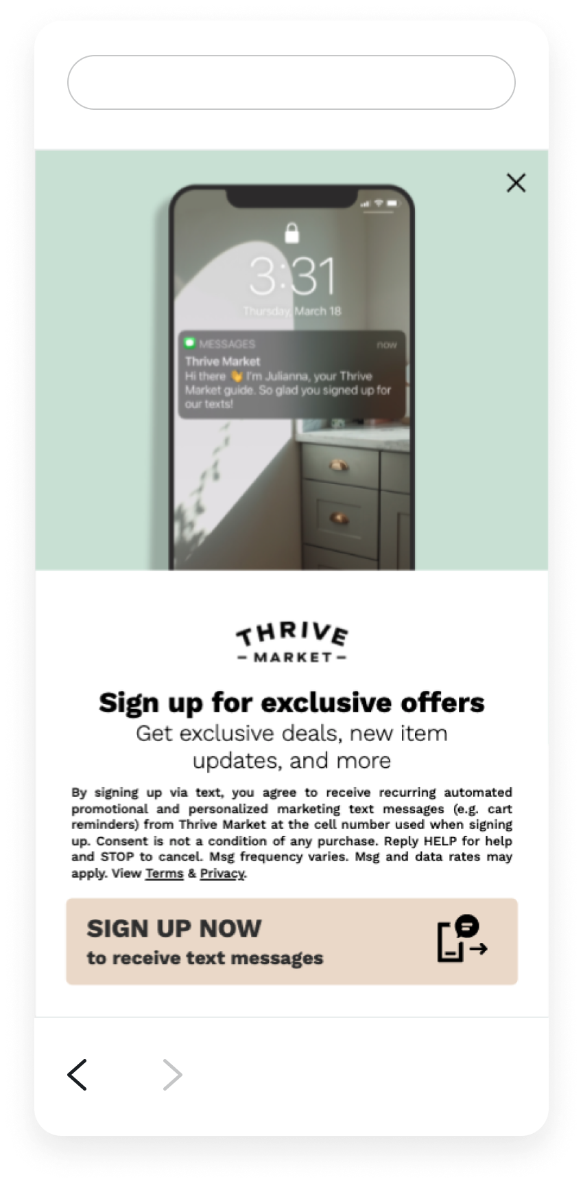 Online grocery store Thrive Market uses Attentive’s “two-tap” sign-up technology on its mobile website to drive SMS opt-ins. Since their brand is membership-based, Thrive Market prompts shoppers to sign-up by giving them a peek into future offers—without needing to offer a direct discount.