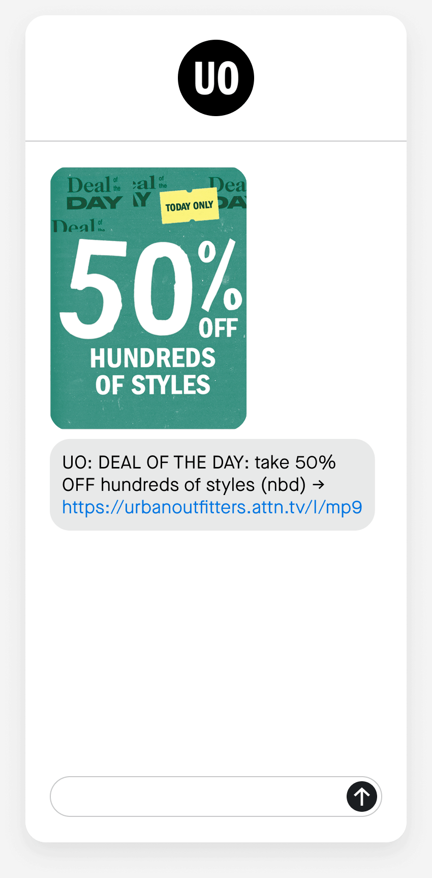 Lifestyle retailer Urban Outfitters sent a “deal of the day” text message offering 50% off hundreds of styles. They included a custom GIF that boldly stated the deal, along with the brand’s logo in the form of a smiley face and a bright yellow ticket that says “today only.” The copywriting in the message (“nbd”) perfectly embodies the fun voice of Urban Outfitters. And, this campaign suggests there will be more daily deals, encouraging repeat browsing while building brand loyalty.