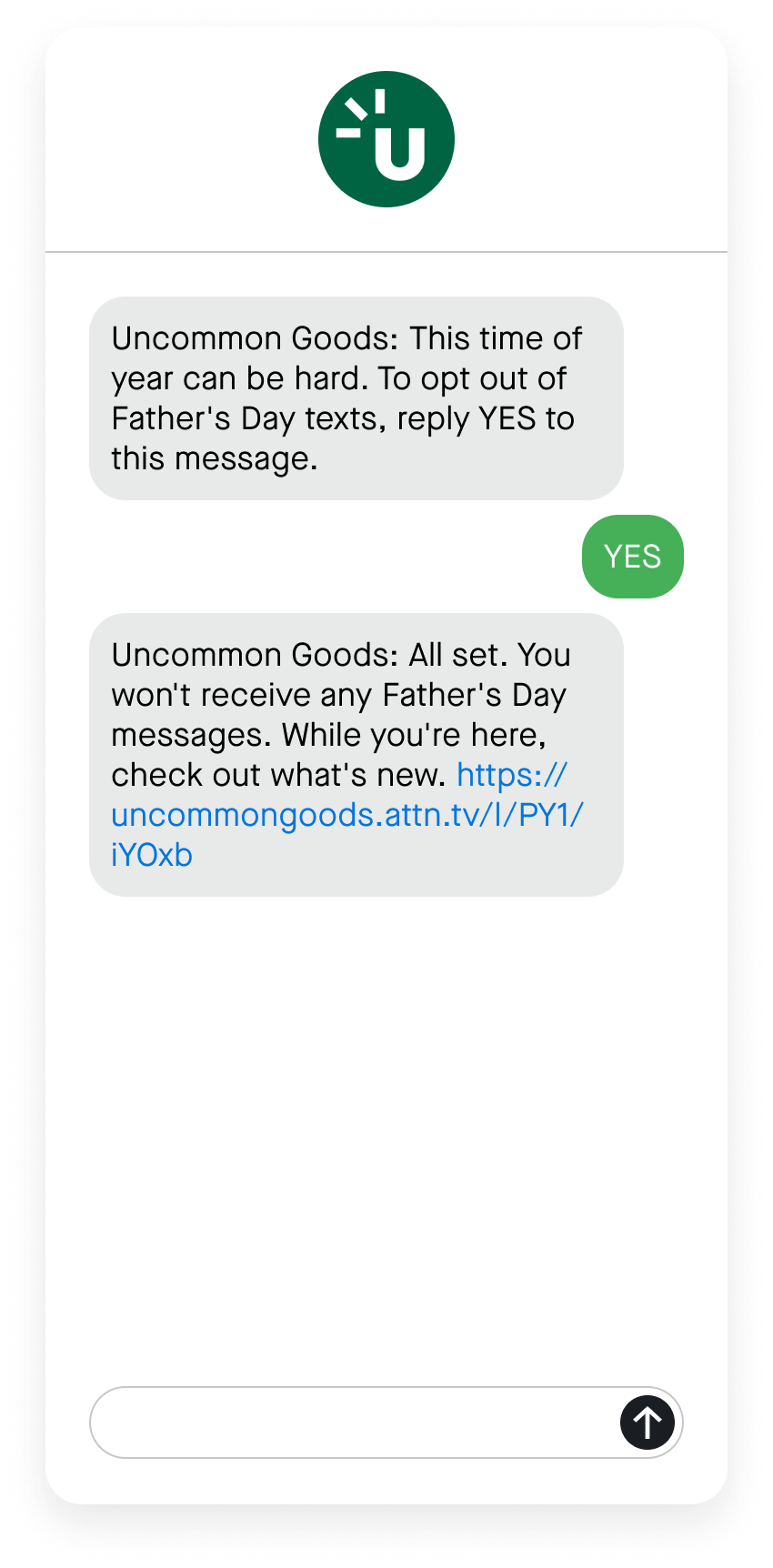 Knowing that Father's Day can be a sensitive time for some people, Uncommon Goods gave their customers the option to opt out of any holiday-related texts. They were also intentional about making sure that anyone who opted out still felt comfortable engaging with the brand during this time, by inviting them to come check out what's new on the site.