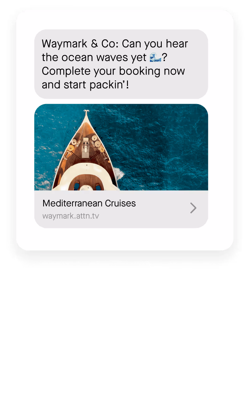 Grow subscriber lists with 30+ sign-up units. Send highly effective messages based on the first-party data customers share with you, like location and travel preferences. Fill last-minute bookings by sending offers based on individuals' travel history that create a sense of urgency.